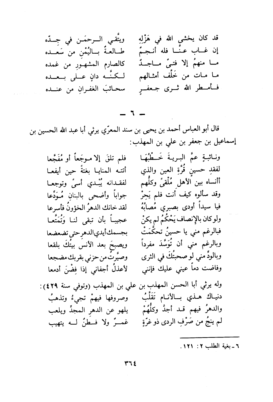 قال أبو العباس أحمد بن يحيى بن سند المعري يرثي أبا عبد الله الحسين بن إسماعيل بن جعفر بن عليّ بن المهذب: