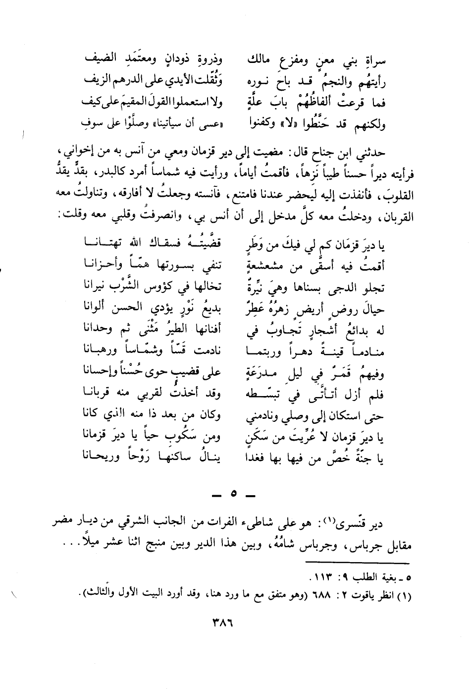 ولكنهم قد حنطوا " لا " وكفنوا ... " عسى أن سيأتينا " وصلوا على سوف حدثني ابن جناح قال: مضيت إلى دير قزمان ومعي من آنس به من إخواني، فرأيته ديرا حسنا طيبا نزها، فأقمت أياما، ورأيت فيه شماسا أمرد كالبدر، بقد يقد القلوب، فأنفذت إليه ليحضر عندنا فامتنع، فآنسته وجعلت لا أفارقه، وتناولت معه القربان، ودخلت معه كل مدخل إلى أن أنس بي، وانصرفت وقلبي معه وقلت: