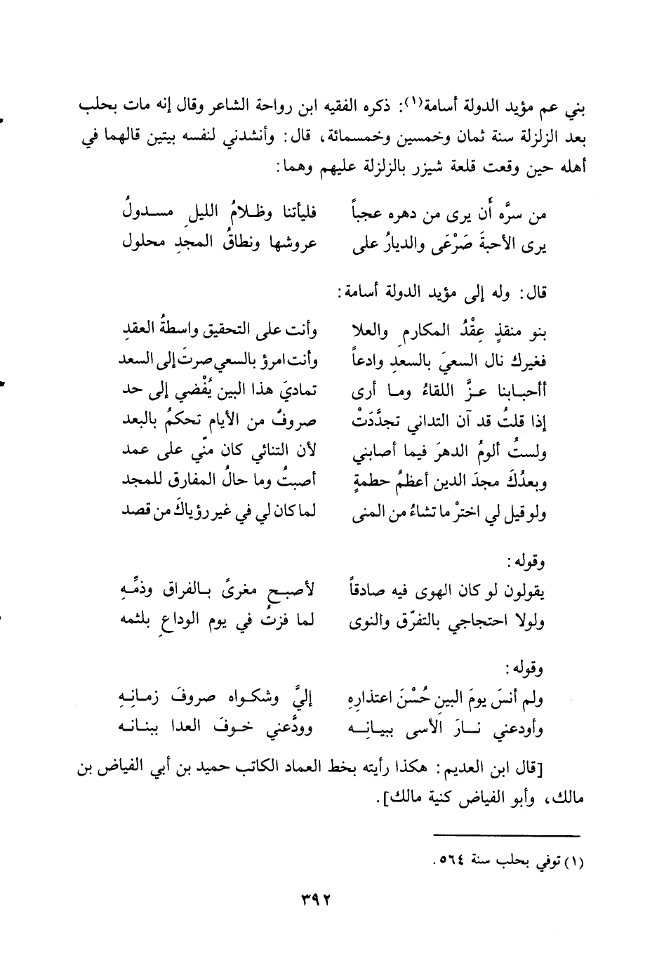 بني عم مؤيد الدولة أسامة (1) : ذكره الفقيه ابن رواحة الشاعر وقال إنه مات بحلب بعد الزلزلة سنة ثمان وخمسين وخمسمائة، قال: وأنشدني لنفسه بيتين قالهما في أهله حين وقعت قلعة شيزر بالزلزلة عليهم وهما: