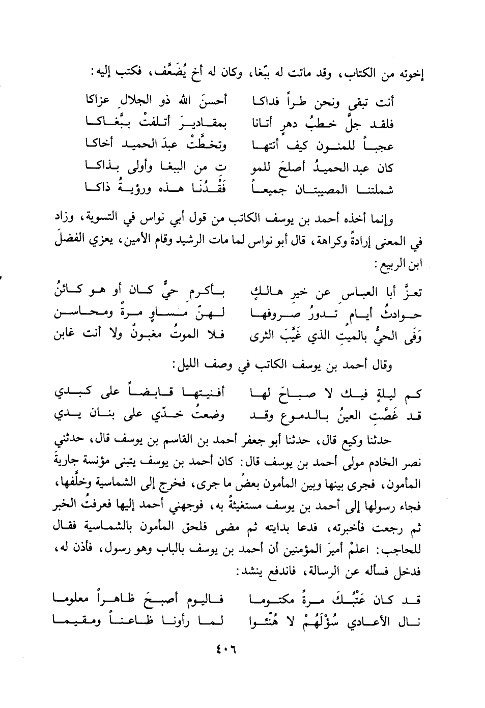 وفى الحي بالميت الذي غيب الثرى ... فلا الموت مغبون ولا أنت غابن وقال أحمد بن يوسف الكاتب في وصف الليل: