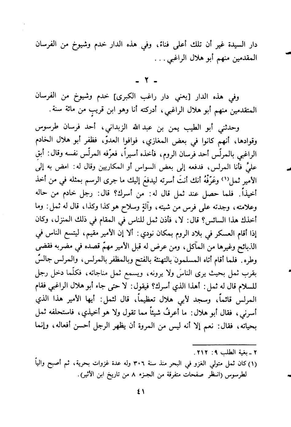 وحدثني أبو الطيب يمن بن عبد الله الزبداني، أحد فرسان طرسوس وقوادها، أنهم كانوا في بعض المغازي، فوافوا العدو، فظفر أبو هلال الخادم الراغبي بالمرلس أحد فرسان الروم، فأخذه أسيراً، فعرفه المرلس نفسه وقال: أبق علي فأنا المرلس، فدفعه إلى بعض السواس أو المكارين وقال له: امض به إلى الأمير ثمل (2) وعرفه انك أنت أسرته ليدفع إليك ما جرى الرسم بمثله في من أخذ أخيذاً. فلما فلما حصل عند ثمل قال له: من أسرك؟ قال: رجل خادم من حاله وعلامته، وجدته على فرس من شيته، والة ٍ وسلاح هو كذا وكذا، قال له ثمل: وما أخذك هذا السائس؟ قال: لا، فأذن فأذن ثمل للناس في المقام في ذلك المنزل، وكان إذا أقام العسكر في بلاد الروم بمكان نودي: ألا إن الأمير مقيم ليتسع الناس في الذبائح وغيرها من المآكل، ومن عرض له قبل الأمير مهم قصد في مضربه فقضى وطره. فلما أقام أتاه المسلمون بالتهنئة بالفتح وبالمظفر بالمرلس، والمرلس جالس بقرب ثمل مناجاته، فكلما دخل رجل للسلام قال له ثمل: أهذا الذي أسرك؟ فيقول: لا حتى جاء أبو هلال الراغبي فقام المرلس قائماً، وسجد لأبي هلال تعظيماً، قال لثمل: أيها الأمير هذا الذي أسرني، فقال أبو هلال: ما أعرف شيئاً مما تقول ولا هو أخيذي، فاستحلفه ثمل بحياته، فقال: نعم إلا أنه ليس من المروة أن يظهر الرجل حسن أفعاله، وإنما