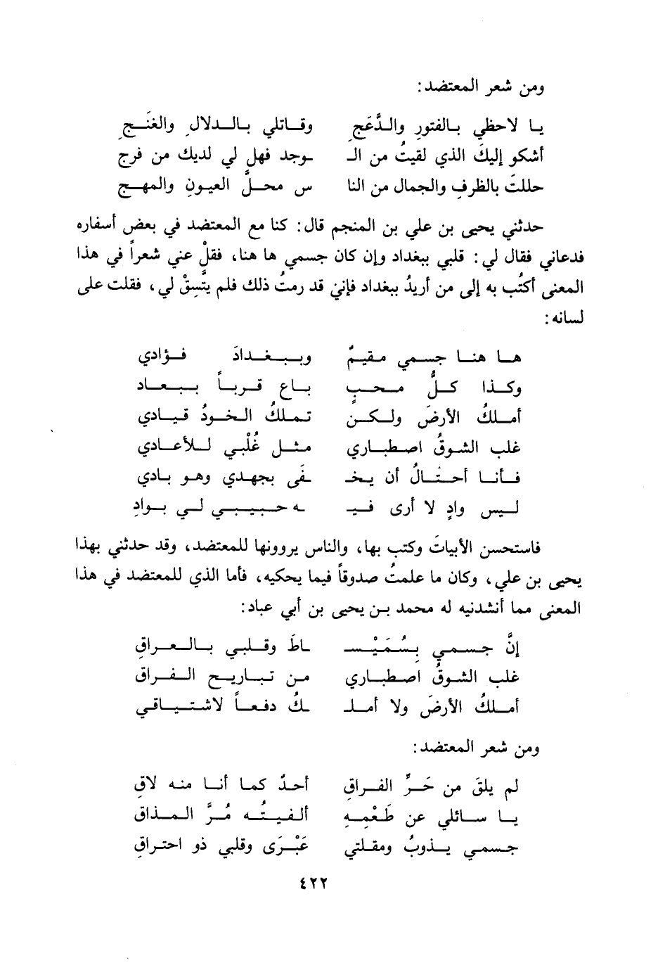 حللت بالظرف والجمال من النا ... س محل العيون والمهج حدثني يحيى بن عليّ بن المنجم قال: كنا مع المعتضد في بعض أسفاره فدعاني فقال لي: قلبي ببغداد وإن كان جسمي ها هنا، فقل عني شعرا في هذا المعنى أكتب به إلى من أريد ببغداد فإني قد رمت ذلك فلم يتسق لي، فقلت على لسانه: