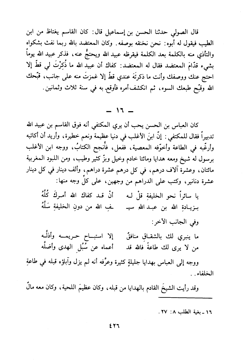 من لا يرى لك طاعة فالله قد ... أعماه عن سبل الهدى وأضله ووجه إلى العباس بهدايا جليلة كثيرة وعرفه أنه لم يزل وآباؤه قبله في طاعة الخلفاء..