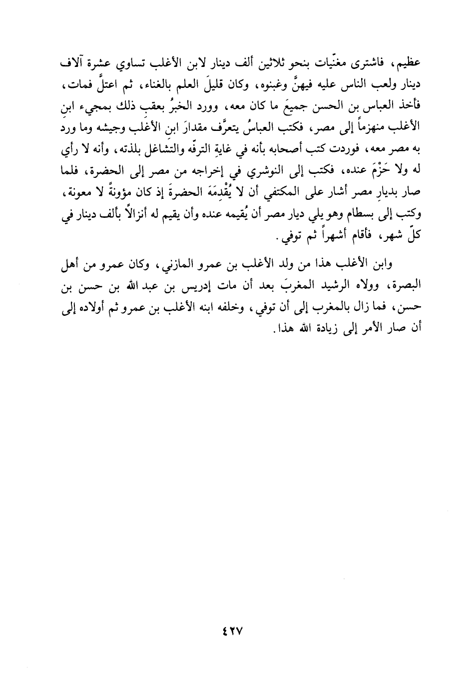 عظيم، فاشترى مغنيات بنحو ثلاثين ألف دينار لابن الأغلب تساوي عشرة آلاف دينار ولعب الناس عليه فيهن وغبنوه، وكان قليل العلم بالغناء، ثم اعتل فمات، فأخذ العباس بن الحسن جميع ما كان معه، وورد الخبر بعقب ذلك بمجيء ابن الأغلب منهزما إلى مصر، فكتب العباس يتعرف مقدار ابن الأغلب وجيشه وما ورد به مصر معه، فوردت كتب أصحابه بأنه في غاية الترفه والتشاغل بلذته، وأنه لا رأي له ولا حزم عنده، فكتب إلى النوشري في إخراجه من مصر إلى الحضرة، فلما صار بديار مصر أشار على المكتفي أن لا يقدمه الحضرة إذ كان مؤونة لا معونة، وكتب إلى بسطام وهو يلي ديار مصر أن يقيمه عنده وأن يقيم له أنزالا بألف دينار في كل شهر، فأقام أشهرا ثم توفي.
