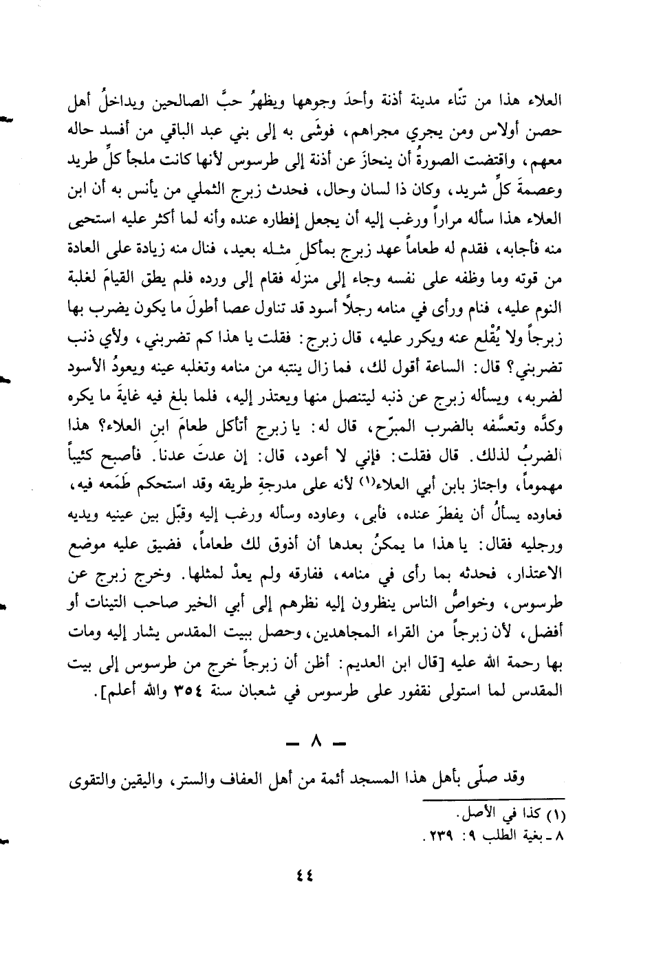 العلاء هذا من تناء مدينة أذنة وأحد وجوهها ويظهر حب الصالحين ويداخل أهل حصن أولاس ومن يجري مجراهم، فوشى به إلى بني عبد الباقي من أفسد حاله معهم، واقتضت الصورة أن ينحاز على أذنة إلى طرسوس لأنها كانت ملجأ كل طريد وعصمة كل شريد، وكان ذا لسان وحال، فحدث زبرج الثلمي من يأنس به أن أبن العلاء هذا سأله مراراً ورغب أليه أن يجعل إفطاره عنده وأنه لما أكثر عليه استحي منه فأجابه، فقدم له طعاماً عند زبرج بمأكل منه بعيد، فنال منه زيادة على العادة من قوته وما وظفه على نفسه وجاء إلى منزله فقام إلى وردة فلم يطق القيام لغلبة النوم عليه، فنام ورأى في منامه رجلاً أسود قد تناول عصا أطول ما يكون يضرب بها زبرجاً ولا يقلع عنه ويكرر عليه، قال زبرج: فقلت يا هذا كم تضربني، ولأي ذنب تضربني؟ قال: الساعة أقول لك، فما زال ينتبه في منامه وتغلب عليه ويعود الأسود لضربه، ويسأله زبرج عن ذنبه ليتنصل منها ويعتذر إليه، فلما بلغ فيه غايةَ ما يكره وكدَّه وتعسّفه بالضرب المبرّح، قال له: يا زبرج أتأكل طعامَ ابنِ العلاء؟ هذا الضربُ لذلك. قال فقلت: فإني لا أعود، قال: إن عدتَ عدنا. فأصبح كئيباً مهموماً، واجتاز بابن أبي العلاء (1) لأنه على مدرجةِ طريقه وقد استحكم طَعَمه فيه، فعاوده يسألُ أن يفطرَ عنده، فأبى، وعاوده وسأله ورغب إليه وقبّل بين عينيه ويديه ورجليه فقال: يا هذا ما يمكنُ بعدها أن أذوق لك طعاماً، فضيق عليه موضع الاعتذار، فحدثه بما رأى في منامه، ففارقه ولم يعدْ لمثلها. وخرج زبرج عن طرسوس، وخواصُّ الناس ينظرون إليه نظرهم إلى أبي الخير صاحب التينات أو أفضل، لأن زبرجاً من القراء المجاهدين، وحصل ببيت المقدس يشار إليه ومات بها رحمة الله عليه [قال ابن العديم: أظن أن زبرجاً خرج من طرسوس إلى بيت المقدس لما استولى نقفور على طرسوس في شعبان سنة 354والله أعلم] .