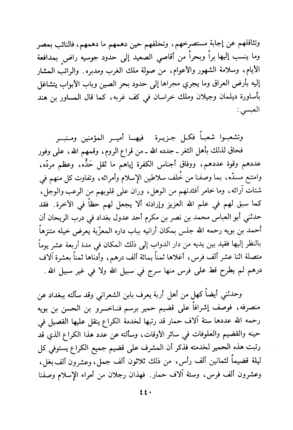 وحدثني أيضاً كهل من أهل أربة يعرف بابن الشعراني وقد سألته ببغداد عن منصرفه، فوصف إشرافاً على قضيم حمير برسم فناخسرو بن الحسن بن بويه رحمه الله عددها ستة آلاف حمار قد رتبها لخدمة الكراع ينقل عليها القصيل في حينه والقضيم والعلوفات في سائر الأوقات، وسألته عن عدد هذا الكراع الذي قد رتبت هذه الحمير لخدمته فذكر أن المشرف على قضيم جميع الكراع يستوفي كل ليلة قضيماً لثمانين ألف رأس، من ذلك ثلاثون ألف جمل، وعشرون ألف بغل، وعشرون ألف فرس، وستة آلاف حمار. فهذان رجلان من أمراء الإسلام وصفنا