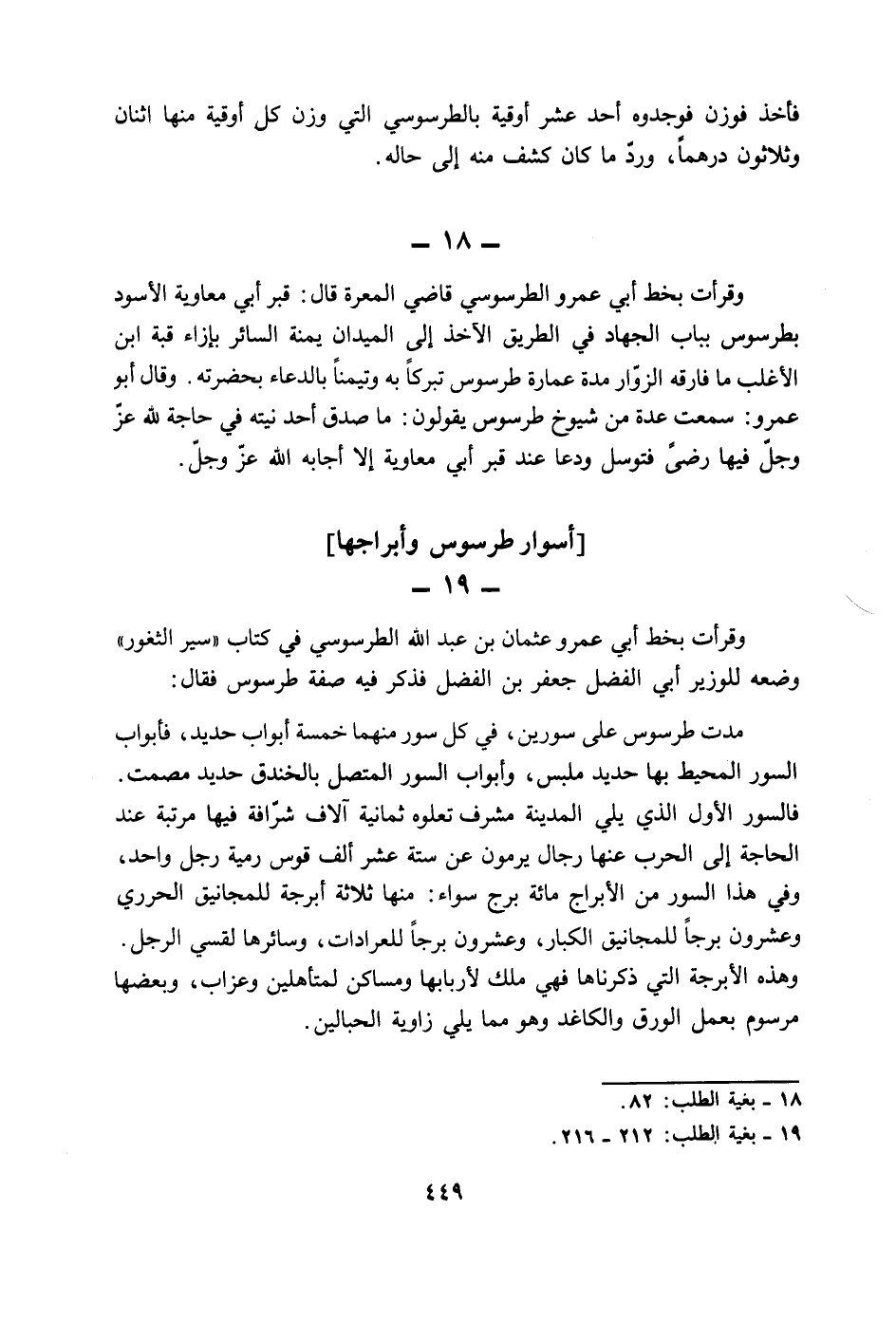وقرأت بخط أبي عمرو عثمان بن عبد الله الطرسوسي في كتاب " سير الثغور " وضعه للوزير أبي الفضل جعفر بن الفضل فذكر فيه صفة طرسوس فقال: