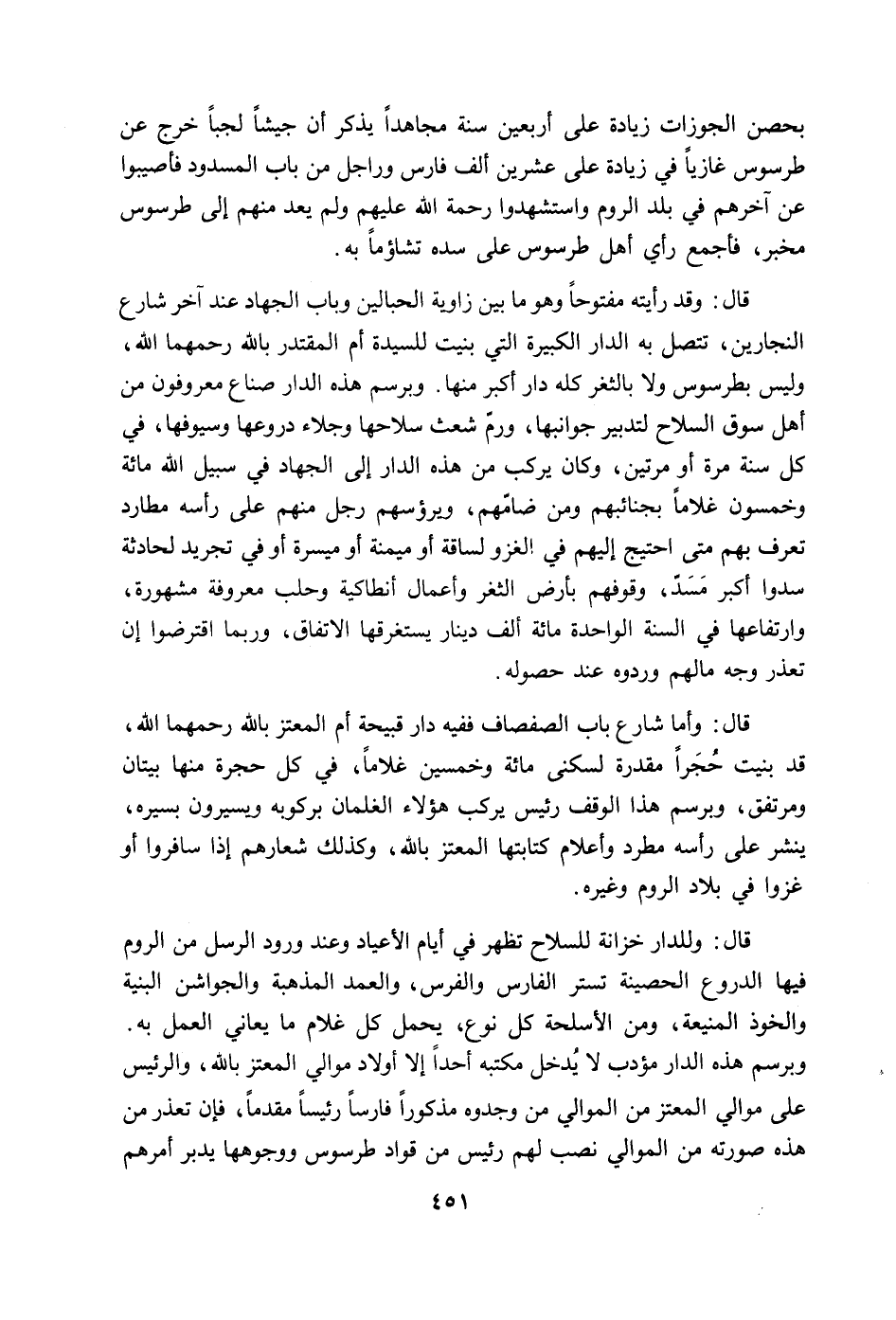 قال: وقد رأيته مفتوحاً وهو ما بين زاوية الحبالين وباب الجهاد عند آخر شارع النجارين، تتصل به الدار الكبيرة التي بنيت للسيدة أم المقتدر بالله رحمهما الله، وليس بطرسوس ولا بالثغر كله دار أكبر منها. وبرسم هذه الدار صناع معروفون من أهل سوق السلاح لتدبير جوانبها، ورم شعث سلاحها وجلاء دروعها وسيوفها، في كل سنة مرة أو مرتين، وكان يركب من هذه الدار إلى الجهاد في سبيل الله مائة وخمسون غلاماً بجنائبهم ومن ضامهم، ويرؤسهم رجل منهم على رأسه مطارد تعرف بهم متى احتيج إليهم في الغزو لساقة أو ميمنة أو ميسرة أو في تجريد لحادثة سدوا أكبر مسد، وقوفهم بأرض الثغر وأعمال أنطاكية وحلب معروفة مشهورة، وارتفاعها في السنة الواحدة مائة ألف دينار يستغرقها الاتفاق، وربما اقترضوا إن تعذر وجه مالهم وردوه عند حصوله.