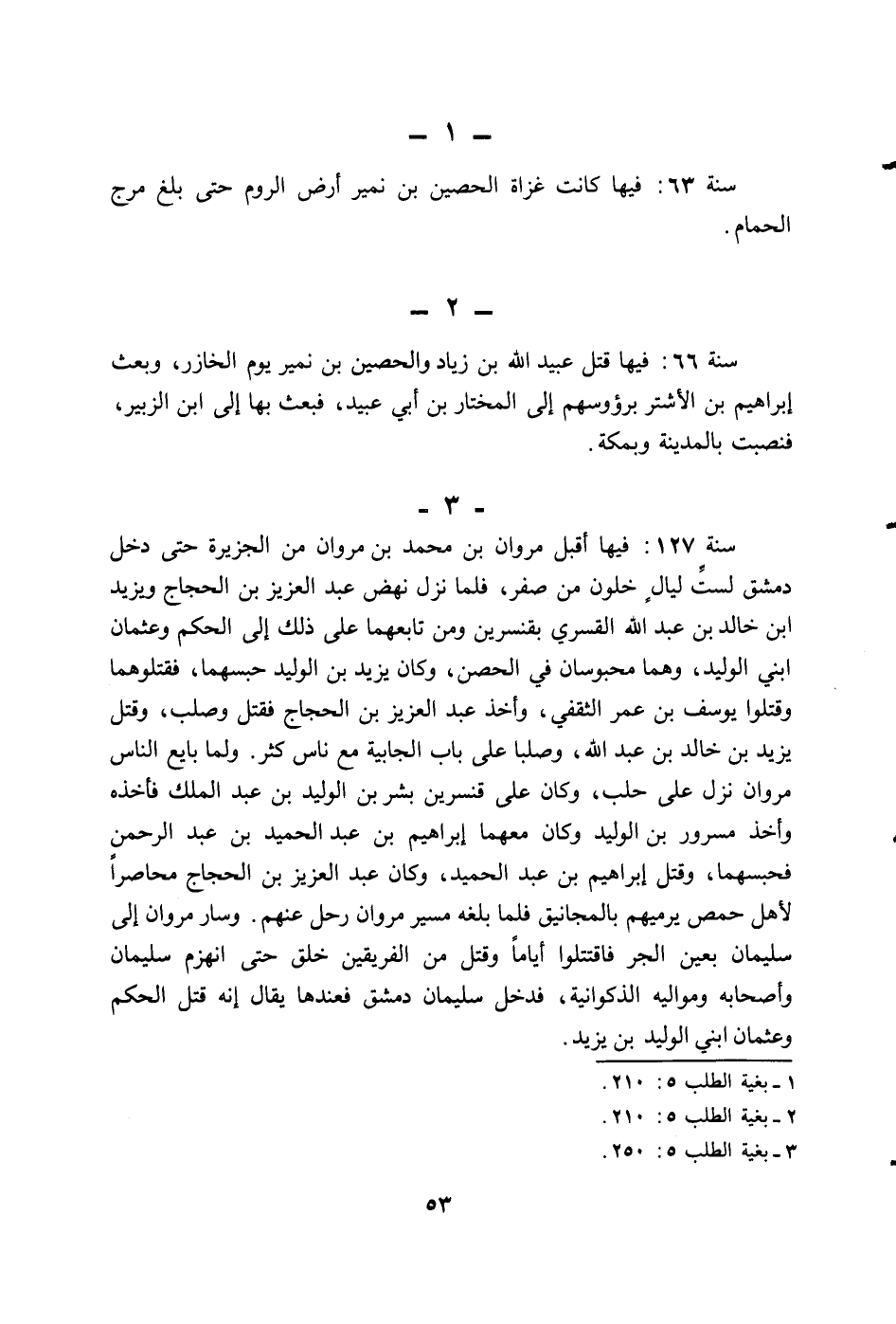سنة 127: فيها اقبل مروان بن محمد بن مروان من الجزيرة حتى دخل دمشق لست ليالٍ خلون من صفر، فلما نزل نهض عبد العزيز بن الحجاج ويزيد ابن خالد بن عبد الله القسري بقنسرين، ومن تابعهما على ذلك الحكم وعثمان ابني الوليد، وهما محبوسان في الحصن، وكان يزيد ابن الوليد حبسهما، فقتلوهما وقتلوا يوسف بن عمر الثقفي، وأخذ عبد العزيز بن الحجاج فقتل وصلب، وقتل يزيد بن خالد بن عبد الله وصلبا على باب الجابية مع ناس كثر ولما بايع الناس مروان نزل على حلب، وكان على قنسرين بشر بن الوليد بن عبد الملك فأخذه واخذ مسرور بن الوليد وكان معهما إبراهيم بن عبد الحميد، وكان عبد العزيز بن الحجاج محاصراً لأهل حمص يرميهم بالمجانيق فلما بلغ مسير مروان رحل عنهم. وسار مروان إلى سليمان بعين الجر فاقتلوا أياماً وقتل من الفريقين خلق حتى انهزم سليمان وأصحابه ومواليه الذكوانية، فدخل سليمان دمشق فعندها يقال إنه قتل الحكم وعثمان ابني الوليد بن يزيد.