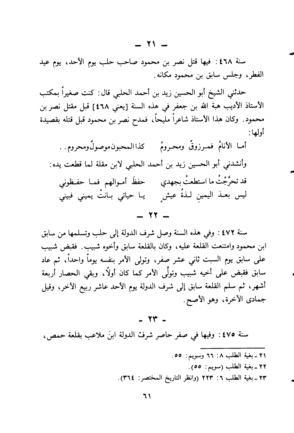 حدثني الشيخ أبو الحسين زيد بن أحمد الحلبي قال كنت صغيراً بمكتب الأستاذ الأديب هبة الله بن جعفر في هذه السنة [يعني 468] قبل مقتل نصر بن محمود. زكان هذا الأستاذ شاعراً مليحاً، فمدح نصر بن محمود قبل قتله بقصيدة أولها: