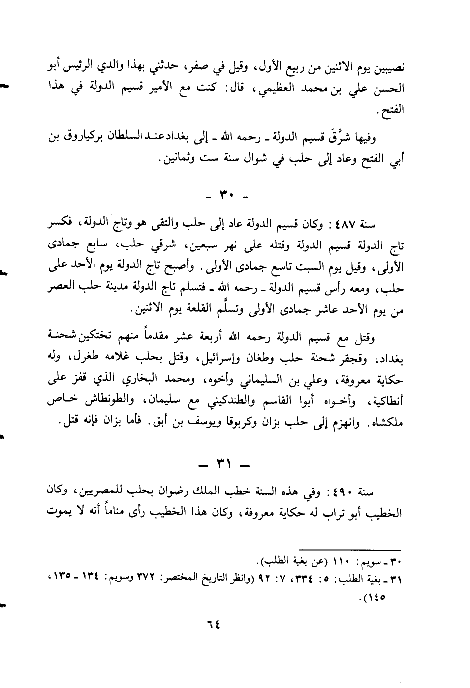 (2) بغية الطلب: 5: 334، 7: 92 (وانظر التاريخ المختصر: 372 وسويم: 134 - 135، 145) .