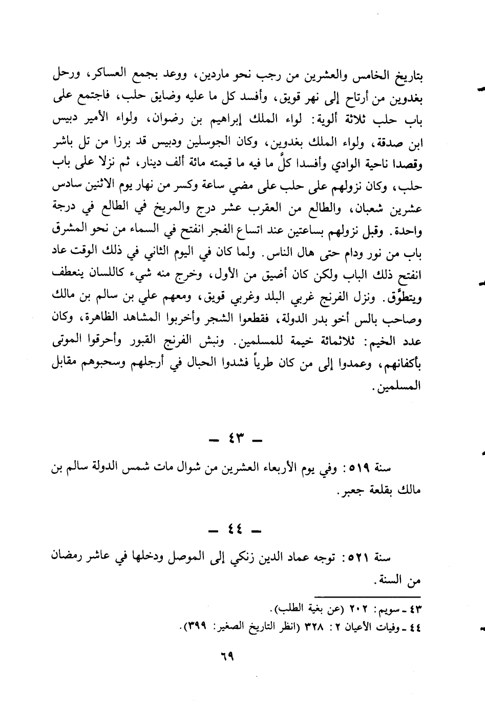بتاريخ الخامس والعشرين من رجب نحو ماردين، ووعد بجمع العساكر، ورحل بغدوين من أرتاح إلى نهر قويق، وأفسد كل ما عليه وضايق حلب، فاجتمع على باب حلب ثلاثة ألوية: لواء الملك إبراهيم بن رضوان، ولواء الأمير دبيس ابن صدقة، ولواء الملك بغدوين، وكان الجوسلين ودبيس قد برزا من تل باشر وقصدا ناحية الوادي وأفسد كل ما فيه ما قيمته مائة ألف دينار، ثم نزلا على باب حلب، وكان نزولهم على حلب على مضي ساعة وكسر من نهار يوم الاثنين سادس عشرين شعبان، والطالع من العقرب عشر درج والمريخ في الطالع في درجة واحدة. وقيل نزولهم بساعتين عند اتساع الفجر انفتح في السماء من نحو المشرق باب من نور ودام حتى هال الناس. ولما كان في اليوم الثاني في ذلك الوقت عاد انفتح ذلك الباب ولكن كان أضيق من الأول، وخرج منه شئ كاللسان ينعطف ويطوَّق. ونزل الإفرنج غربي البلد وغربي قويق، ومعهم علي بن سالم بن مالك وصاحب بالس أخو بدر الدولة، فقطعوا الشجر وأخربوا المشاهد الظاهرة، وكان عدد الخيم: ثلاثمائة خيمة للمسلمين. ونبش الفرنج القبور وأحرقوا الموتى بأكفانه، وعمدوا إلى من كان طرياً فشدوا الحبال في أرجلهم وسحبوهم مقبل المسلمين.