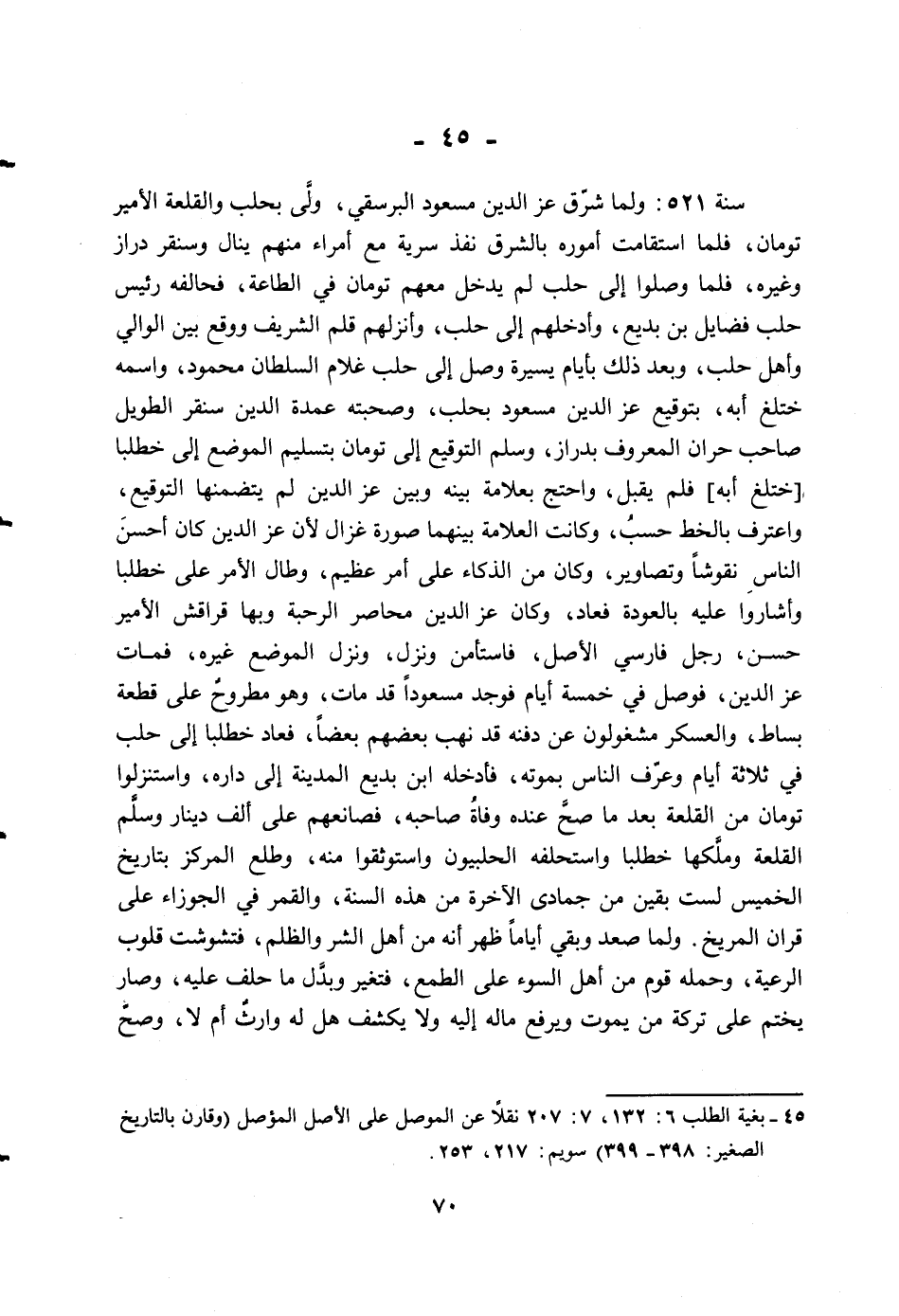 (1) بغية الطلب 6: 132، 7: 207 نقلاً عن الموصل على الأصل المؤصل (وقارن بالتاريخ الصغير: 398 - 399) سويم: 217، 253.
