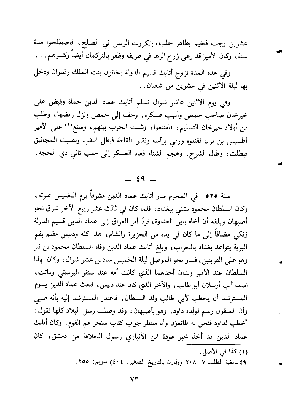 سنة 525: في المحرم سار أتابك عماد الدين مشرقاً يوم الخميس عبرته، وكان السلطان محمود يشتي ببغداد، فلما كان في ثالث عشر ربيع الآخر شرق نحو أصبهان وبلغه عن أخاع باين العداوة، فردً أمر العراق إلى عماد الدين قسيم الدولة زنكي مضافاً إلى ما كان في يده من الجزيرة والشام، وهذا كله ودبيس مقيم بفم البرية يتواعد بغداد بالخراب، وبلغ أتابك عماد الدين وفاة السلطان محمود بن نبر وهو على القريتين، فسار نحو الموصل ليلة الخميس سادس عشر من شوال، وكان لهذا السلطان عند الأمير ولدان أجدهما الذي كان أمه عند سنقر البرسقي وماتت، أسمه ألب أرسلان أبو طالب، والآخر الذي كان عند دبيس، فبعث عماد الدين يسوم المسترشد أن يخطب لأبي طالب ولد السلطان، فأعتذر المسترشد إليه بأنه صبي وإن المنقول رسم لولده داود، وهو بإصبهان، وقد وصلت رسل البلاد كلها تقول: أخطب لداود فنحن له طائعون ونحن ننتظر جواب كتاب زنجر عم القوم. وكان أتابك عماد الدين قد أخذ خبر عودة ابن الأنباري رسول الخلافة من دمشق، وكان