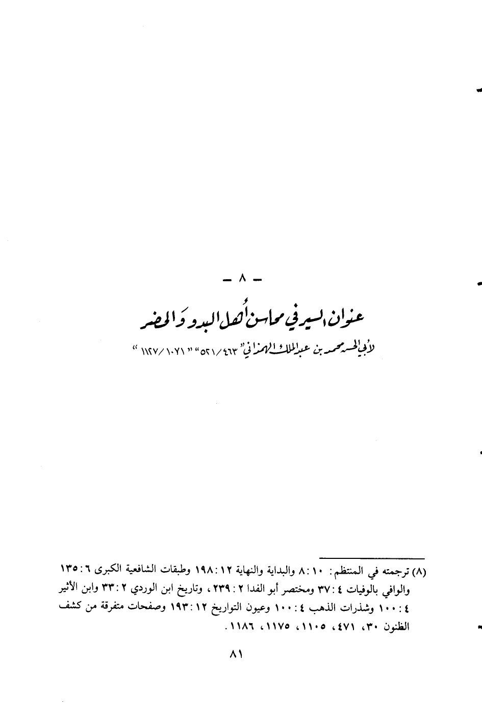 (1) ترجمته في المنتظم: 10: 8 والبداية والنهاية 12: 198 وطبقات الشافعية الكبرى 6: 135 والوافي بالوفيات 4: 37 ومختصر أبو الفدا 2: 239، وتاريخ ابن الوردي 2: 33 وابن الأثير 4: 100 وشذرات الذهب 4: 100 وعيون التواريخ 12: 193 وصفحات متفرقة من كشف الظنون 30، 471، 1105، 1175، 1186.
