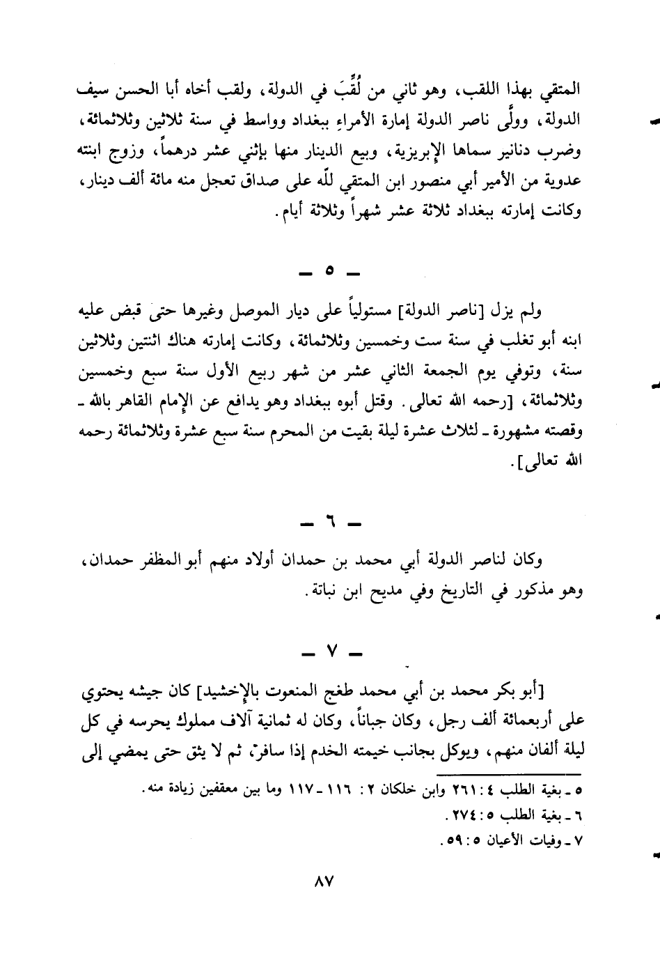 ولم يزل [ناصر الدولة] مستولياً على ديار الموصل وغيرها حتى قبض عليه ابنه أبو تغلب في سنة ست وخمسين وثلاثمائة، وكانت إمارته هناك اثنتين وثلاثين سنة، وتوفي يوم الجمعة الثاني عشر من شهر ربيع الأول سنة سبع وخمسين وثلاثمائة، [رحمه الله تعالى. وقتل أبوه ببغداد وهو يدافع عن الإمام القاهر بالله وقصته مشهورة لثلاث عشرة ليلة بقيت من المحرم سنة سبع عشرة وثلاثمائة رحمه الله تعالى] .