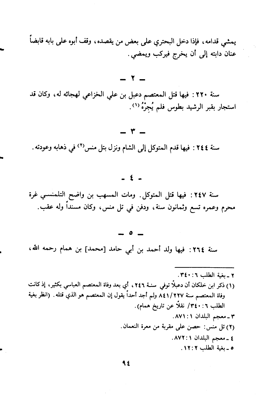 (2) ذكر ابن خلكان أن دعبلاً توفي سنة 246، أي بعد وفاة المعتصم العباسي بكثير، إذ كانت وفاة المعتصم سنة 227/841 ولم أجد أحداً يقول إن المعتصم هو الذي قتله. (انظر بغية الطلب 6: 340/ نقلاً عن تاريخ همام) .