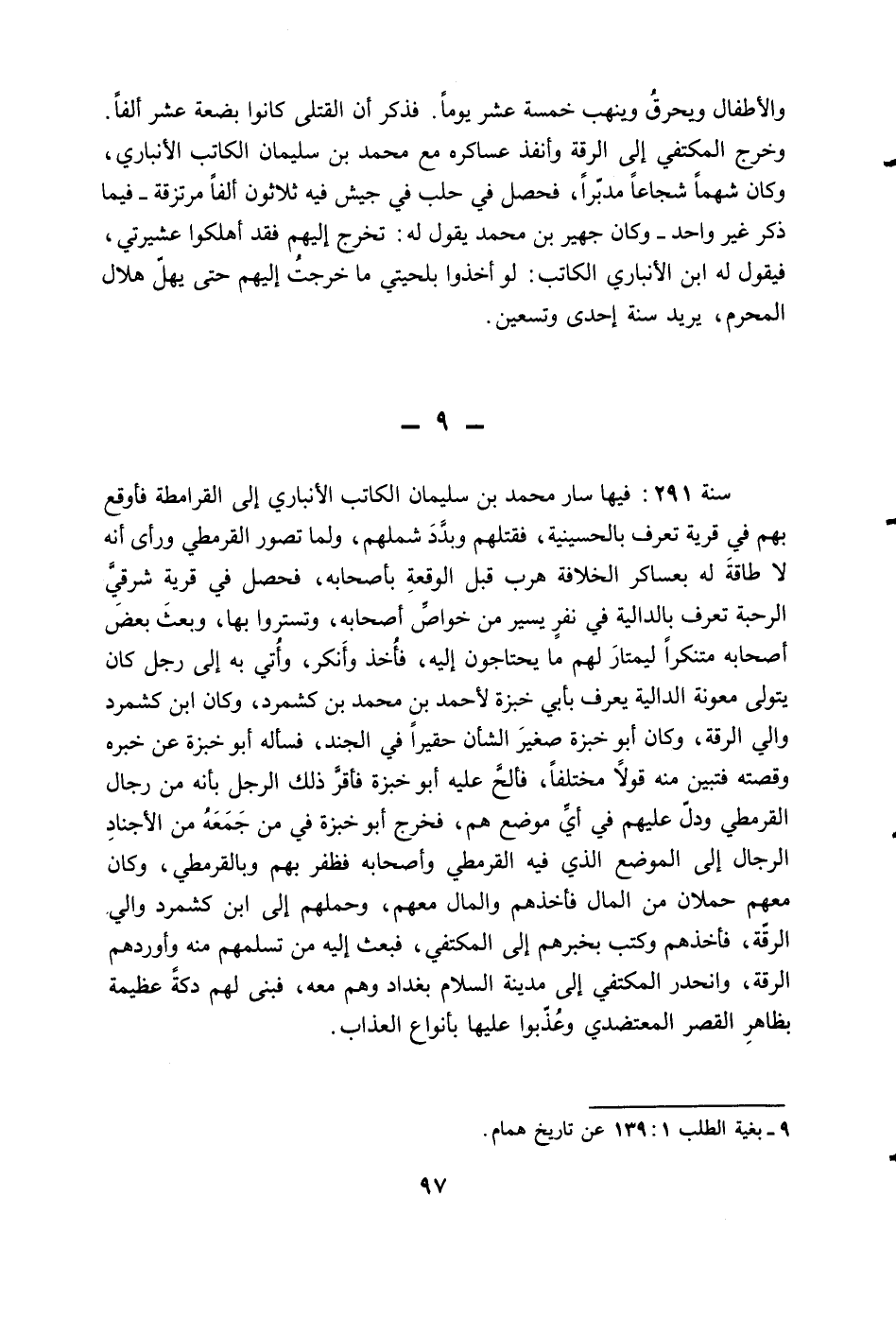 والأطفال ويحرقُ وينهب خمسة عشر يوماً. فذكر أن القتلى كانوا بضعة عشر ألفاً. وخرج المكتفي إلى الرقة وأنفذ عساكره مع محمد بن سليمان الكاتب الأنباري، وكان شهماً شجاعاً مدّبراً، فحصل في حلب في جيش فيه ثلاثون الفاً مرتزقة فيما ذكر غير واحد وكان جهير بن محمد يقول له: تخرج إليهم فقد أهلكوا عشيرتي، فيقول له ابن الأنباري الكاتب: لو أخذوا بلحيتي ما خرجتُ إليهم حتى يهلّ هلال المحرم، يريد سنة إحدى وتسعين.