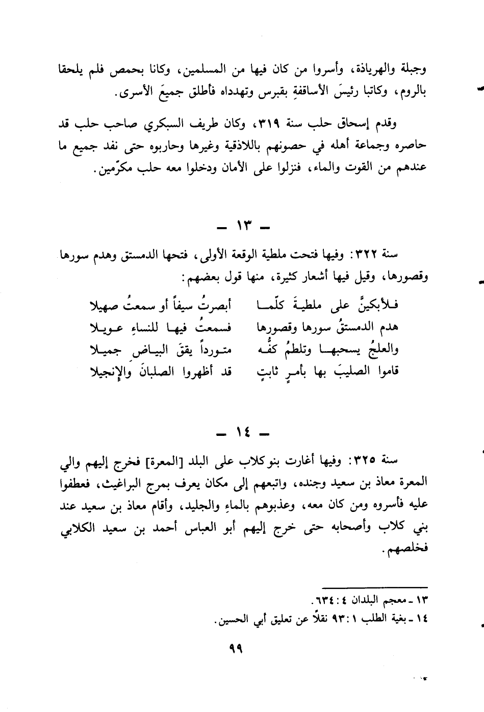 سنة 325: وفيها أغارت بنو كلاب على البلد [المعرة] فخرج إليهم والي المعرة معاذ بن سعيد وجنده، واتبعهم إلى مكان يعرف بمرج البراغيث، فعطفوا عليه فأسروا ومن كان معه، وعذبهم بالماء والجليد، وأقام معاذ بن سعيد عند بني كلاب وأصحابه حتى خرج إليهم أبو العباس أحمد بن سعيد الكلابي فخلصهم.