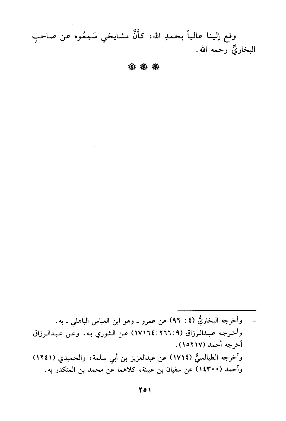 وَقَعَ إِلَيْنَا عَالِيًا بِحَمْدِ اللَّهِ، كَأَنَّ مَشَايِخِي سَمِعُوهُ عَنْ صَاحِبِ الْبُخَارِيِّ رَحِمَهُ اللَّهُ