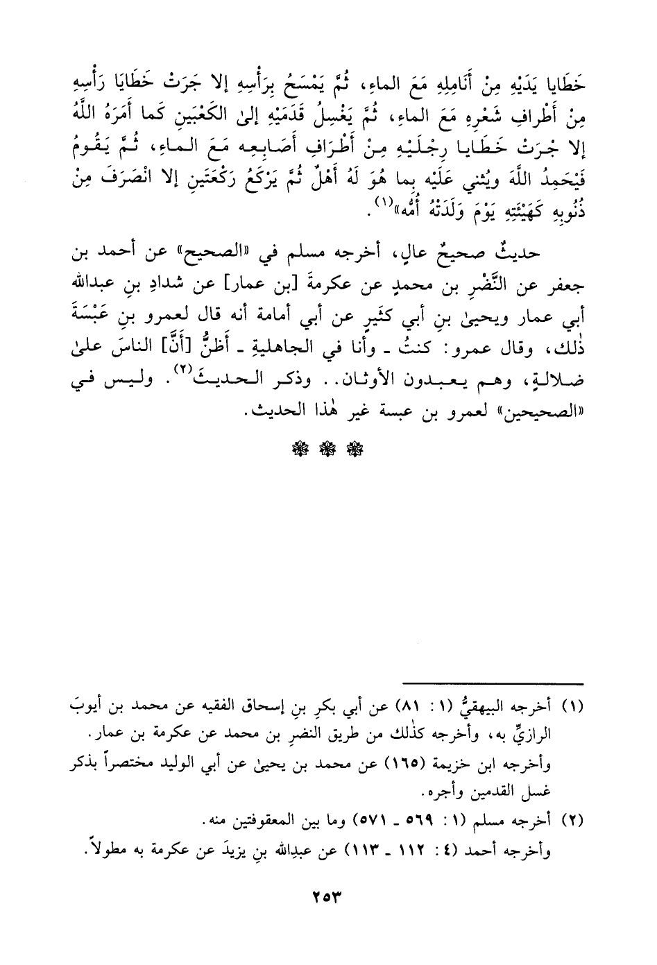 خَطَايَا يَدَيْهِ مِنْ أَنَمُلِهِ مَعَ الْمَاءِ، ثُمَّ يَمْسَحُ بِرَأْسِهِ إِلَّا جَرَتْ خَطَايَا رَأْسِهِ مِنْ أَطْرَافِ شَعْرِهِ مَعَ الْمَاءِ، ثُمَّ يَغْسِلُ قَدَمَيْهِ إِلَى الْكَعْبَينِ كَمَا أَمَرَهُ اللَّهُ إِلَّا جَرَتْ خَطَايَا رِجْلَيْهِ مِنْ أَطْرَافِ أَصَابِعِهِ مَعَ الْمَاءِ، ثُمَّ يَقُومُ فَيْحَمِدُ اللَّهَ وَيُثْنِي عَلَيْهِ بِمَا هُوَ لَهُ أَهْلٌ ثُمَّ يَرْكَعُ رَكْعَتَينِ إِلَّا انْصَرَفَ مِنْ ذُنُوبِهِ كَهَيْئَتِهِ يَوْمَ وَلَدَتْهُ أُمُّهُ» ، حَدِيثٌ صَحِيحٌ عَالٍ، أَخْرَجَهُ مُسْلِمٌ فِي الصَّحِيحِ عَنْ أَحْمَدَ بْنِ جَعْفَرٍ، عَنِ النَّضْرِ بْنِ مُحَمَّدٍ، عَنْ عِكْرِمَةَ بْنِ عَمَّارٍ، عَنْ شَدَّادِ بْنِ عَبْدِ اللَّهِ أَبِي عَمَّارٍ، وَيَحْيَى بْنِ أَبِي كَثِيرٍ، عَنْ أَبِي أُمَامَةَ، أَنَّهُ قَالَ لِعَمْرِو بْنِ عَبْسَةَ ذَلِكَ، وَقَالَ عَمْرُو: كُنْتُ، وَأَنَا فِي الْجَاهِلِيَّةِ، أَظُنُّ أَنَّ النَّاسَ عَلَى ضَلَالَةٍ، وَهُمْ يَعْبُدُونَ الْأَوْثَانَ. . وَذَكَرَ الْحَدِيثَ.