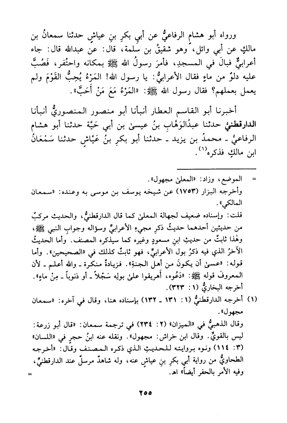 وَرَوَاهُ أَبُو هِشَامٍ الرِّفَاعِيُّ، عَنْ أَبِي بَكْرِ بْنِ عَيَّاشٍ، حَدَّثَنَا سَمْعَانُ بْنُ مَالِكٍ، عَنْ أَبِي وَائِلٍ وَهُوَ شَقِيقُ بْنُ سَلَمَةَ، قَالَ: عَنْ عَبْدِ اللَّهِ، قَالَ: جَاءَ أَعْرَابِيٌّ فَبَالَ فِي الْمَسْجِدِ، فَأَمَرَ رَسُولُ اللَّهِ صَلَّى اللَّهُ عَلَيْهِ وَسَلَّمَ بِمَكَانِهِ وَاحْتُفِرَ، فَصُبَّ عَلَيْهِ دَلْوٌ مِنْ مَاءٍ، فَقَالَ الْأَعْرَابِيُّ: يَا رَسُولَ اللَّهِ! الْمَرْءُ يُحِبُّ الْقَوْمَ وَلَمْ يَعْمَلْ بِعَمَلِهِمْ؟ فَقَالَ رَسُولُ اللَّهِ صَلَّى اللَّهُ عَلَيْهِ وَسَلَّمَ: «الْمَرْءُ مَعَ مَنْ أَحَبَّ» ، أَخْبَرَنَا أَبُو الْقَاسِمِ الْعَطَّارُ، أَنْبَأَنَا أَبُو مَنْصُورٍ الْمَنْصُورِيُّ، أَنْبَأَنَا الدَّارَقُطْنِيُّ، حَدَّثَنَا عَبْدُ الْوَهَّابِ بْنُ عِيسَى بْنِ أَبِي حَيَّةَ، حَدَّثَنَا أَبُو هِشَامٍ الرِّفَاعِيُّ مُحَمَّدُ بْنُ يَزِيدَ، حَدَّثَنَا أَبُو بَكْرِ بْنُ عَيَّاشٍ، حَدَّثَنَا سَمْعَانُ بْنُ مَالِكٍ، فَذَكَرَهُ