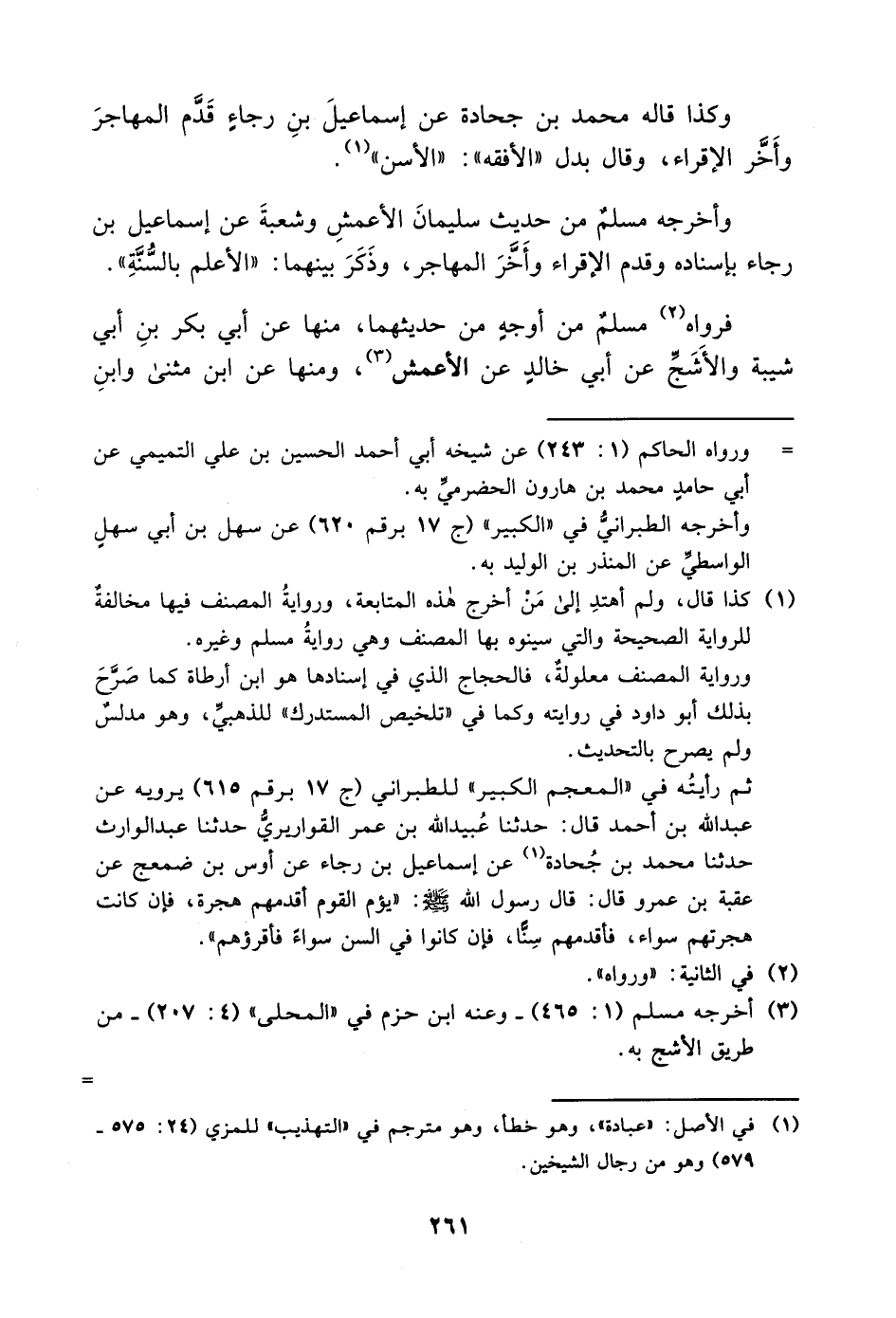 وَكَذَا قَالَهُ مُحَمَّدُ بْنُ جَحَادَةَ، عَنْ إِسْمَاعِيلَ بْنِ رَجَاءٍ قَدَّمَ الْمُهَاجِرَ وَأَخَّرَ الْإِقْرَاءَ، وَقَالَ بَدَلَ «الْأَفْقَهِ» : «الْأَسَنُّ» .