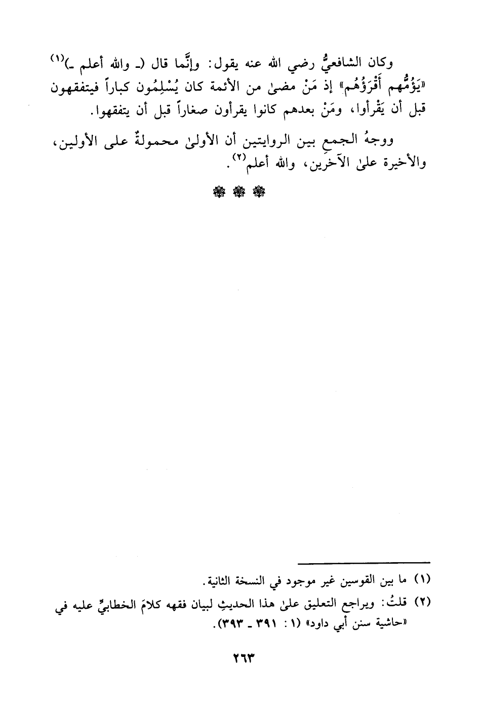وَكَانَ الشَّافِعِيُّ رَضِيَ اللَّهُ عَنْهُ يَقُولُ: وَإِنَّمَا قَالَ وَاللَّهُ أَعْلَمُ: «يَؤُمُهُمْ أَقْرَؤُهُمْ» إِذْ مَنْ مَضَى مِنَ الْأَئِمَّةِ كَانَ يُسْلِمُونَ كِبَارًا فَيَتَفَقَّهُونَ قَبْلَ أَنْ يَقْرَءُوا، وَمَنْ بَعْدَهُمْ كَانُوا يَقْرَءُونَ صِغَارًا قَبْلَ أَنْ يَتَفَقَّهُوا.