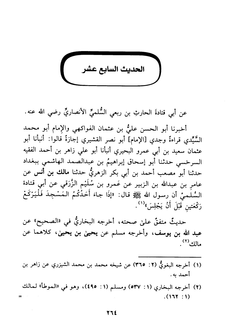 أَخْبَرَنَا أَبُو الْحَسَنِ عَلِيُّ بْنُ عُثْمَانَ الْفَوَاكِهِيُّ، وَالْإِمَامُ أَبُو مُحَمَّدٍ السَّيِّدِيُّ، قِرَاءَةً، وَجَدِّيَ الْإِمَامُ أَبُو نَصْرٍ الْقُشَيْرِيُّ، إِجَازَةً، قَالُوا: أَنْبَأَنَا أَبُو عُثْمَانَ سَعِيدُ بْنُ أَبِي عَمْرٍو الْبَحِيرِيُّ، أَنْبَأَنَا أَبُو عَلِيٍّ زَاهِرُ بْنُ أَحْمَدَ الْفَقِيهُ السَّرْخَسِيُّ، حَدَّثَنَا أَبُو إِسْحَاقَ إِبْرَاهِيمُ بْنُ عَبْدِ الصَّمَدِ الْهَاشِمِيُّ، بِبَغْدَادَ، حَدَّثَنَا أَبُو مُصْعَبٍ أَحْمَدُ بْنُ أَبِي بَكْرٍ الزُّهْرِيُّ، حَدَّثَنَا مَالِكُ بْنُ أَنَسَ، عَنْ عَامِرِ بْنِ عَبْدِ اللَّهِ بْنِ الزُّبَيْرِ، عَنْ عَمرِو بْنِ سُلَيْمٍ الزُّرَقِيِّ، عَنْ أَبِي قَتَادَةَ السُّلَمِيِّ، أَنَّ رَسُولَ اللَّهِ صَلَّى اللَّهُ عَلَيْهِ وَسَلَّمَ قَالَ: «إِذَا جَاءَ أَحَدُكُمُ الْمَسْجِدَ فَلْيَرْكَعْ رَكْعَتَيْنِ قَبْلَ أَنْ يَجْلِسَ» ، حَدِيثٌ مُتَّفَقٌ عَلَى صِحَّتِهِ، أَخْرَجَهُ الْبُخَارِيُّ فِي «الصَّحِيحِ» عَنْ عَبْدِ اللَّهِ بْنِ يُوسُفَ، وَأَخْرَجَهُ مُسْلِمٌ عَنْ يَحْيَى بْنِ يَحْيَى، كِلَاهُمَا عَنْ مَالِكٍ.