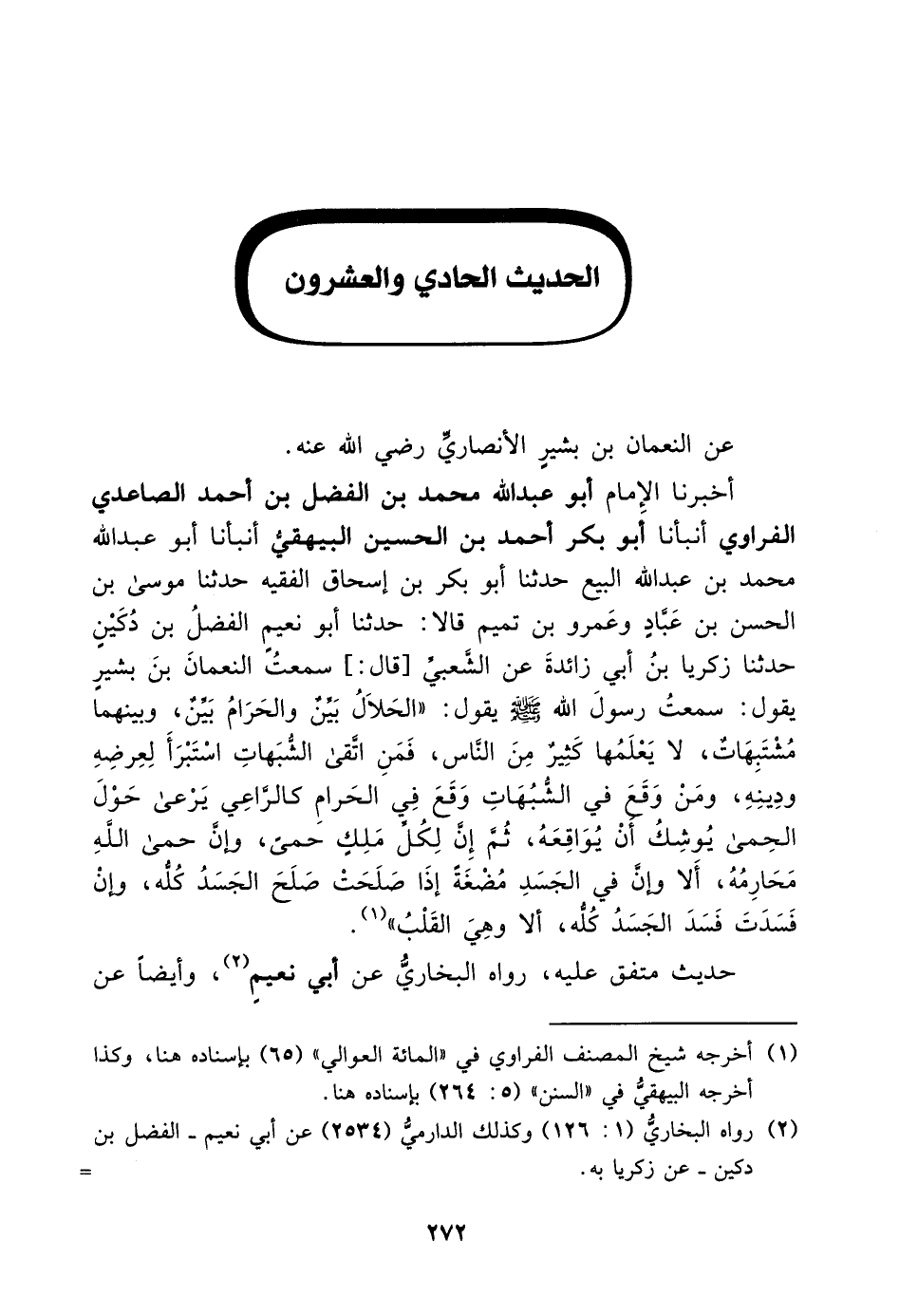أَخْبَرَنَا الْإِمَامُ أَبُو عَبْدِ اللَّهِ مُحَمَّدُ بْنُ الْفَضْلِ بْنِ أَحْمَدَ الصَّاعِدِيُّ الْفَرَّاوِيُّ، أَنْبَأَنَا أَبُو بَكْرٍ أَحْمَدُ بْنُ الْحُسَيْنِ الْبَيْهَقِيُّ، أَنْبَأَنَا أَبُو عَبْدِ اللَّهِ مُحَمَّدُ بْنُ عَبْدِ اللَّهِ الْبَيِّعُ، حَدَّثَنَا أَبُو بَكْرِ بْنُ إِسْحَاقَ الْفَقِيهُ، حَدَّثَنَا مُوسَى بْنُ الْحَسَنِ بْنِ عَبَّادٍ، وَعَمْرُو بْنُ تَمِيمٍ، قَالَا: حَدَّثَنَا أَبُو نُعَيْمٍ الْفَضْلُ بْنُ دُكَيْنٍ، حَدَّثَنَا زَكَرِيَّا بْنُ أَبِي زَائِدَةَ، عَنِ الشَّعْبِيِّ، قَالَ: سَمِعْتُ النُّعْمَانَ بْنَ بَشِيرٍ، يَقُولُ: سَمِعْتُ رَسُولَ اللَّهِ صَلَّى اللَّهُ عَلَيْهِ وَسَلَّمَ يَقُولُ: «الْحَلَالُ بَيِّنٌ وَالْحَرَامُ بَيِّنٌ، وَبَيْنَهُمَا مُشْتَبِهَاتٌ، لَا يَعْلَمُهَا كَثِيرٌ مِنَ النَّاسِ، فَمَنِ اتَّقَى الشُّبُهَاتِ اسْتَبْرَأَ لِعِرْضِهِ وَدِينِهِ، وَمَنْ وَقَعَ فِي الشُّبُهَاتِ وَقَعَ فِي الْحَرَامِ كَالرَّاعِي يَرْعَى حَوْلَ الْحِمَى يُوشِكُ أَنْ يُوَاقِعَهُ، ثُمَّ إِنَّ لِكُلِّ مَلِكٍ حِمًى، وَإِنَّ حِمَى اللَّهِ مَحَارِمُهُ، أَلَا وَإِنَّ فِي الْجَسَدِ مُضْغَةً إذَا صَلَحَتْ صَلَحَ الْجَسَدُ كُلُّهُ، وَإِنْ فَسَدَتْ فَسَدَ الْجَسَدُ كُلُّهُ، أَلَا وَهِيَ الْقَلْبُ» ، حَدِيثٌ مُتَّفَقٌ عَلَيْهِ، رَوَاهُ الْبُخَارِيُّ، عَنْ أَبِي نُعَيْمٍ، وَأَيْضًا عَنْ
