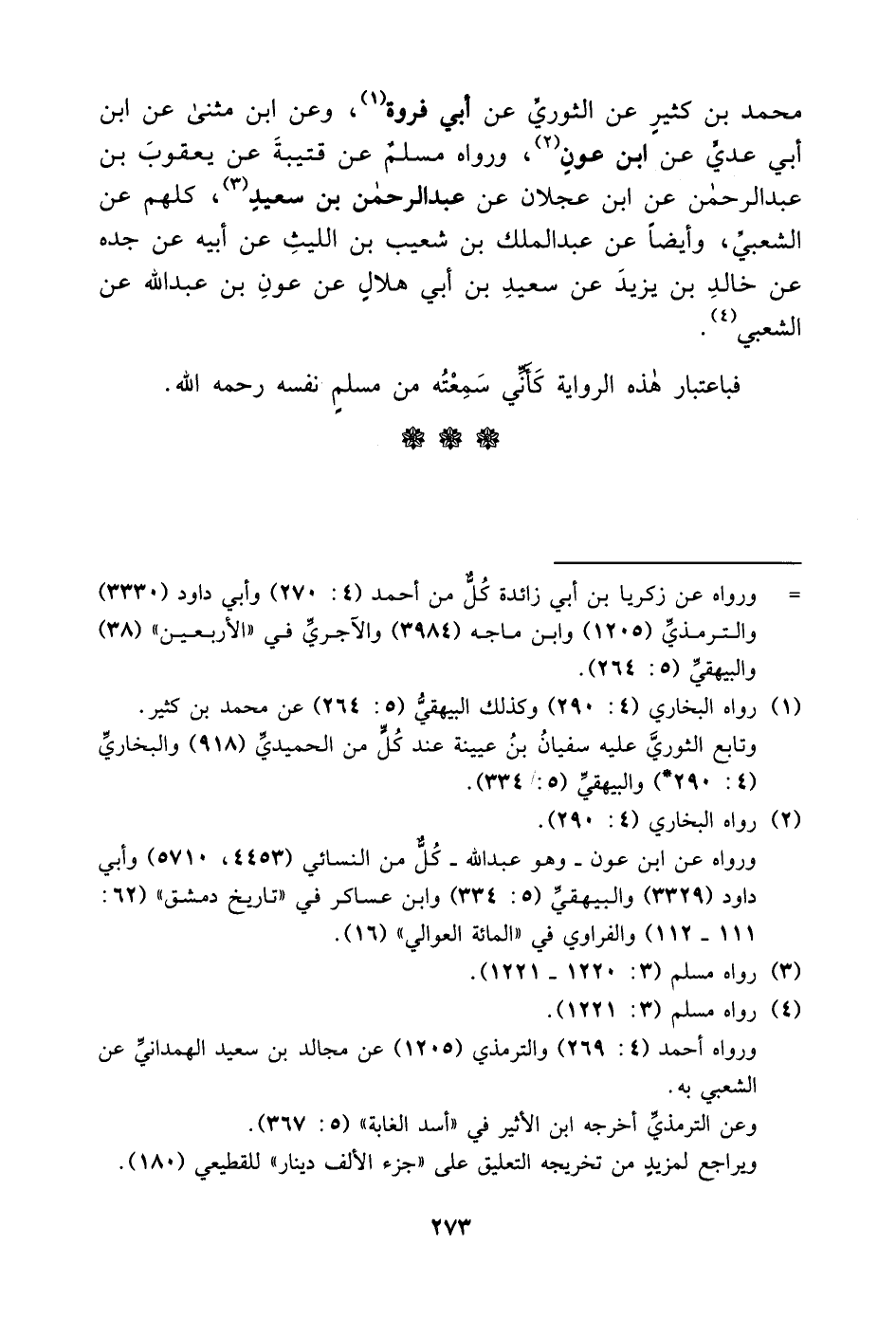 مُحَمَّدِ بْنِ كَثِيرٍ، عَنِ الثَّوْرِيِّ، عَنْ أَبِي فَرْوَةَ، وَعَنِ ابْنِ مُثَنَّى، عَنِ ابْنِ أَبِي عَدِيٍّ، عَنِ ابْنِ عَوْنٍ، وَرَوَاهُ مُسْلِمٌ عَنْ قُتَيْبَةَ، عَنْ يَعْقُوبَ بْنِ عَبْدِ الرَّحْمَنِ، عَنِ ابْنِ عَجْلَانَ، عَنْ عَبْدِ الرَّحْمَنِ بْنِ سَعِيدٍ، كُلُّهُمْ عَنِ الشَّعْبِيِّ، وَأَيْضًا عَنْ عَبْدِ الْمَلِكِ بْنِ شُعَيْبِ بْنِ اللَّيْثِ، عَنْ أَبِيهِ، عَنْ جَدِّهِ، عَنْ خَالِدِ بْنِ يَزِيدَ، عَنْ سَعِيدِ بْنِ أَبِي هِلَالٍ، عَنْ عَوْنِ بْنِ عَبْدِ اللَّهِ، عَنِ الشَّعْبِيِّ.