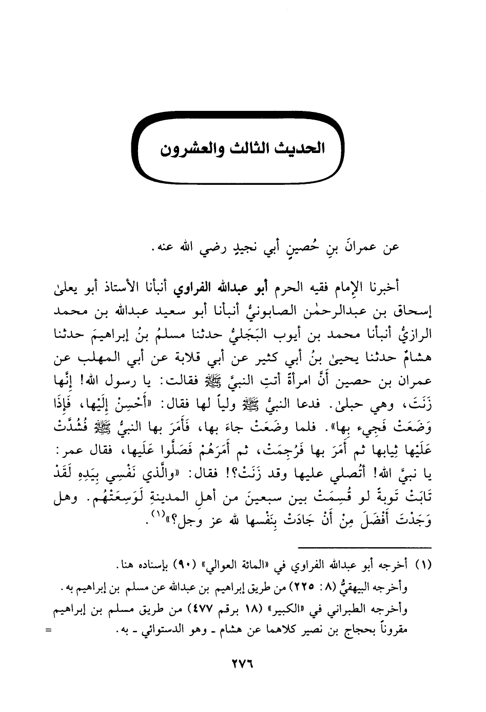 أَخْبَرَنَا الْإِمَامُ فَقِيهُ الْحَرَمِ أَبِو عَبْدِ اللَّهِ الْفَرَّاوِيُّ، أَنْبَأَنَا الْأُسْتَاذُ أَبُو يَعْلَى إِسْحَاقُ بْنُ عَبْدِ الرَّحْمَنِ الصَّابُونِيُّ، أَنْبَأَنَا أَبُو سَعِيدٍ عَبْدُ اللَّهِ بْنُ مُحَمَّدٍ الرَّازِيُّ، أَنْبَأَنَا مُحَمَّدُ بْنُ أَيُّوبَ الْبَجَلِيُّ، حَدَّثَنَا مُسْلِمُ بْنُ إِبْرَاهِيمَ، حَدَّثَنَا خِشَامٌ، حَدَّثَنَا يَحْيَى بْنُ أَبِي كَثِيرٍ، عَنْ أَبِي قُلَابَةَ، عَنْ أَبِي الْمُهَلَّبِ، عَنْ عِمْرَانَ بْنِ حُصَيْنٍ، أَنَّ امْرَأَةً أَتَتِ النَّبِيَّ صَلَّى اللَّهُ عَلَيْهِ وَسَلَّمَ، فَقَالَتْ: يَا رَسُوَلَ اللَّهِ! إِنَّهَا زَنَتَ، وَهِيَ حُبْلَى، فَدَعَا النَّبِيُّ صَلَّى اللَّهُ عَلَيْهِ وَسَلَّمَ وَلِيًّا لَهَا فَقَالَ: «أَحْسِنْ إِلَيْهَا، فَإِذَا وَضَعَتْ فَجِيءَ بِهَا» ، فَلَمَّا وَضَعَتْ جَاءَ بِهَا، فَأَمَرَ بِهَا النَّبِيُّ صَلَّى اللَّهُ عَلَيْهِ وَسَلَّمَ فَشَدَّتْ عَلَيْهَا ثِيَابَهَا ثُمَّ أَمَرَ بِهَا فَرُجِمَتْ، ثُمَّ أَمَرَهُمْ فَصَلَّوْا عَلَيْهَا، فَقَالَ عُمَرُ: يَا نَبِيَّ اللَّهِ! أَتُصَلِّي عَلَيْهَا وَقَدْ زَنَتْ؟ ! فَقَالَ: «وَالَّذِي نَفْسِي بِيَدِهِ لَقَدْ تَابَتْ تَوْبَةً لَوْ قُسِمَتْ بَيْنَ سَبْعِينَ مِنْ أَهْلِ الْمَدِينَةِ لَوَسِعَتْهُمْ، وَهَلْ وَجَدْتَ أَفْضَلَ مِنْ أَنْ جَادَتْ بِنَفْسِهَا لِلَّهِ عَزَّ وَجَلَّ؟» ،
