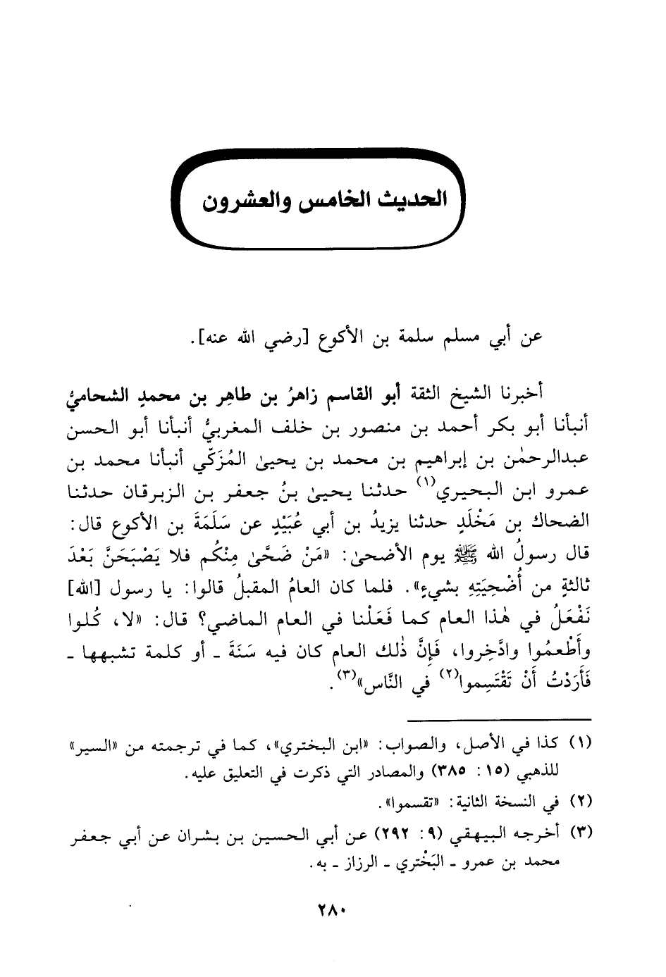 أَخْبَرَنَا الشَّيْخُ الثِّقَةُ أَبُو الْقَاسِمِ زَاهِرُ بْنُ طَاهِرِ بْنِ مُحَمَّدٍ الشَّحَامِيُّ، أَنْبَأَنَا أَبُو بَكْرٍ أَحْمَدُ بْنُ مَنْصُورِ بْنُ خَلَفٍ الْمَغْرِبِيُّ، أَنْبَأَنَا أَبُو الْحَسَنِ عَبْدُ الرَّحْمَنِ بْنُ إِبْرَاهِيمَ بْنِ مُحَمَّدِ بْنِ يَحْيَى الْمُزَكِّي، أَنْبَأَنَا مُحَمَّدُ بْنُ عَمْرِو بْنِ الْبَحِيرِيِّ، حَدَّثَنَا يَحْيَى بْنُ جَعْفَرِ بْنِ الزِّبْرِقَانِ، حَدَّثَنَا الضَّحَّاكُ بْنُ مَخْلَدٍ، حَدَّثَنَا يَزِيدُ بْنُ أَبِي عُبَيْدٍ، عَنْ سَلَمَةَ بْنِ الْأَكْوَعِ، قَالَ: قَالَ رَسُولُ اللَّهِ صَلَّى اللَّهُ عَلَيْهِ وَسَلَّمَ يَوْمَ الْأَضْحَى: «مَنْ ضَحَّى مِنْكُمْ فَلَا يَصْبَحَنَّ بَعْدَ ثَالِثَةٍ مِنْ أُضْحِيَتِهِ بِشَيْءٍ» ، فَلَمَّا كَانَ الْعَامُ الْمُقْبِلُ قَالُوا: يَا رَسُولَ اللَّهِ نَفْعَلُ فِي هَذَا الْعَامِ كَمَا فَعَلْنَا فِي الْعَامِ الْمَاضِي؟ قَالَ: «لَا، كُلُوا وَأَطْعِمُوا وَادَّخِرُوا، فَإِنَّ ذَلِكَ الْعَامَ كَانَ فِيهِ سَنَةً، أَوْ كَلِمَةً تُشْبِهُهَا، فَأَرَدْتُ أَنْ تَقْتَسِمُوا فِي النَّاسِ» ،