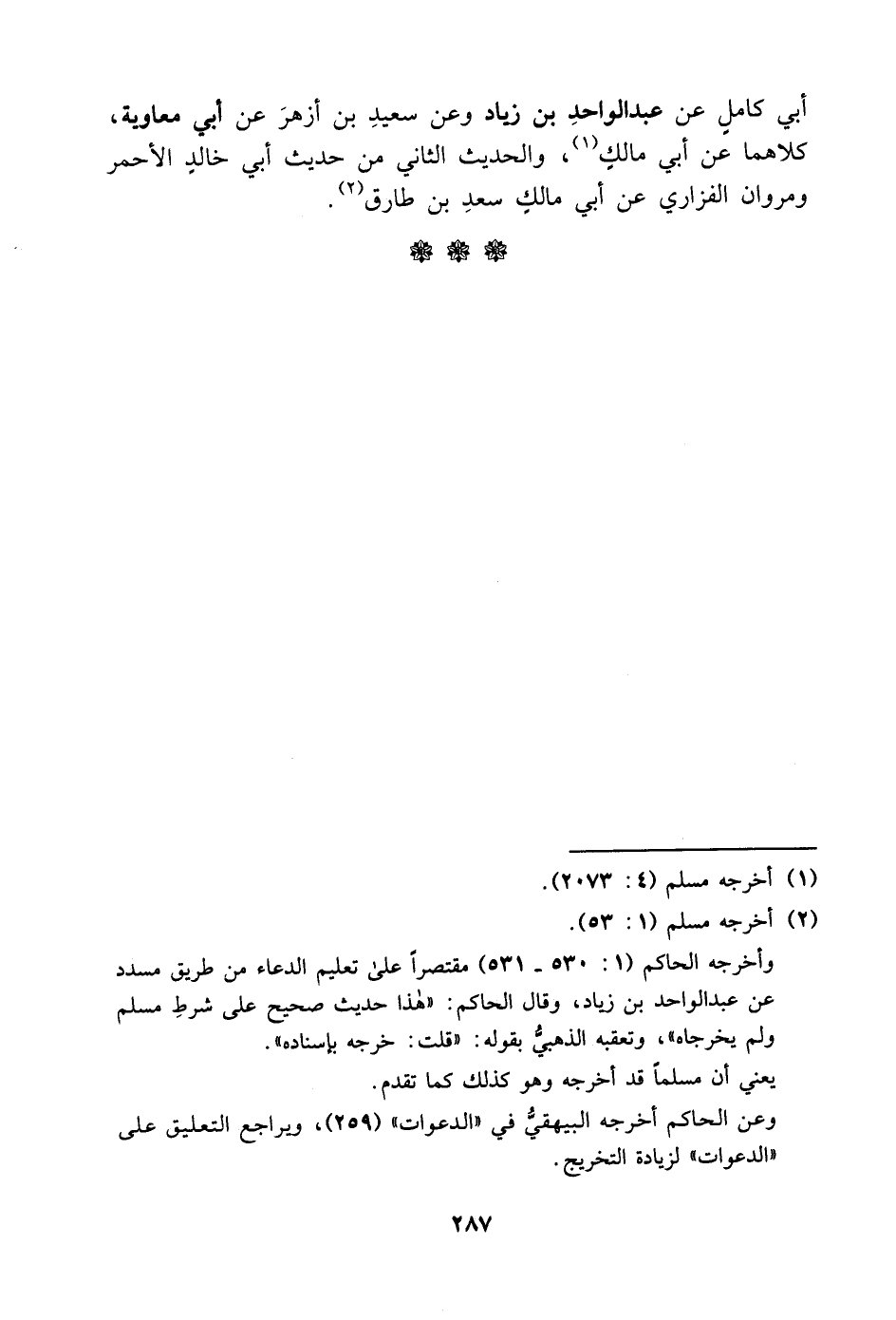 أَبُي كَامِلٍ، عَنْ عَبْدِ الْوَاحِدِ بْنِ زِيَادٍ، وَعَنْ سَعِيدِ بْنِ أَزْهَرَ، عَنْ أَبِي مُعَاوِيَةَ كِلَاهُمَا عَنْ أَبِي مَالِكٍ، وَالْحَدِيثُ الثَّانِي مِنْ حَدِيثِ أَبِي خَالِدٍ الْأَحْمَرِ، وَمَرْوَانَ الْفَزَارِيِّ، عَنْ أَبِي مَالِكٍ سَعْدِ بْنِ طَارِقٍ