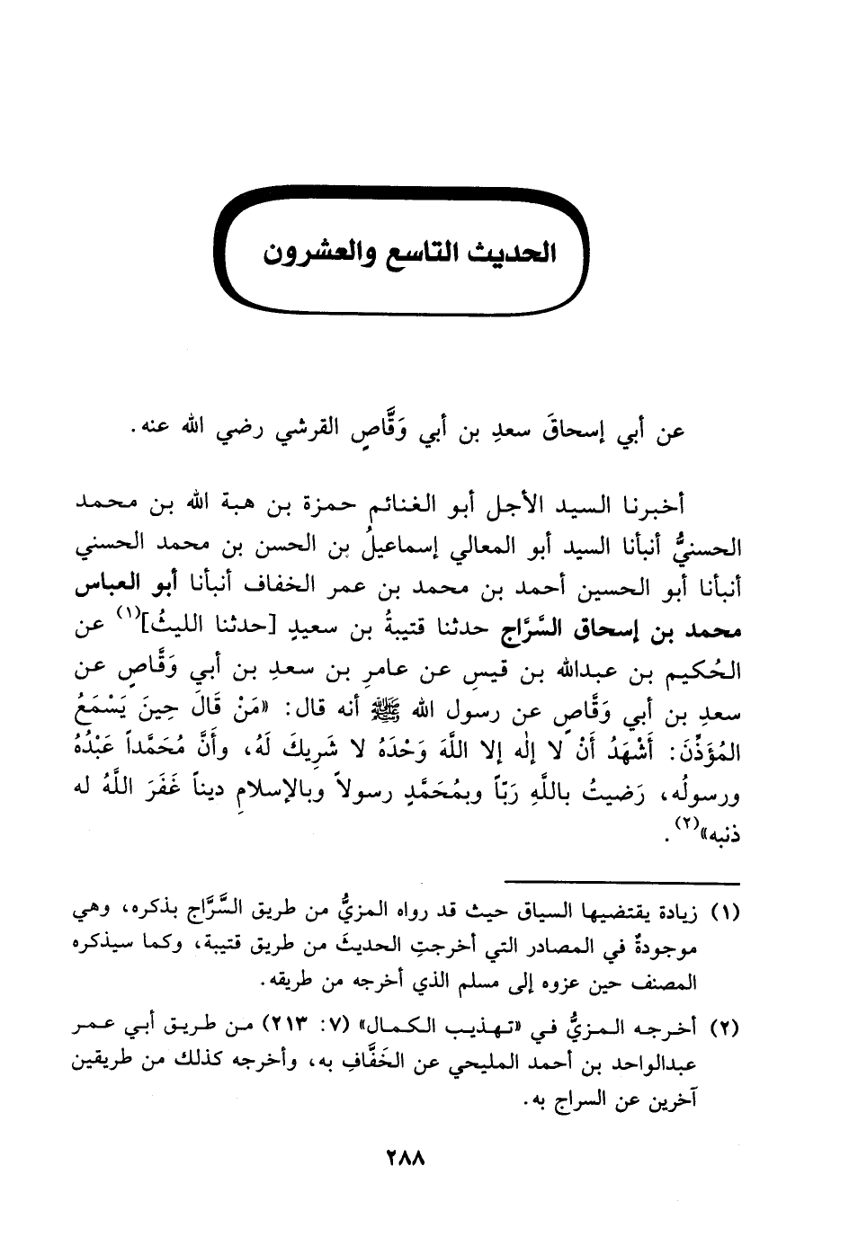 أَخْبَرَنَا السَّيِّدُ الْأَجَلُّ أَبُو الْغَنَائِمِ حَمْزَةُ بْنُ هِبَةِ اللَّهِ بْنِ مُحَمَّدٍ الْحَسَنِيُّ، أَنْبَأَنَا السَّيِّدُ أَبُو الْمَعَالِي إِسْمَاعِيلُ بْنُ الْحَسَنِ بْنِ مُحَمَّدٍ الْحَسَنِيُّ، أَنْبَأَنَا أَبُو الْحُسَيْنِ أَحْمَدُ بْنُ مُحَمَّدِ بْنِ عُمَرَ الْخَفَّافُ، أَنْبَأَنَا أَبُو الْعَبَّاسِ مُحَمَّدُ بْنُ إِسْحَاقَ السَّرَّاجُ، حَدَّثَنَا قُتَيْبَةُ بْنُ سَعِيدٍ، حَدَّثَنَا اللَّيْثُ، عَنِ الْحُكَيْمِ بْنِ عَبْدِ اللَّهِ بْنِ قَيْسٍ، عَنْ عَامِرِ بْنِ سَعْدِ بْنِ أَبِي وَقَّاصٍ، عَنْ سَعْدِ بْنِ أَبِي وَقَّاصٍ، عَنْ رَسُولِ اللَّهِ صَلَّى اللَّهُ عَلَيْهِ وَسَلَّمَ، أَنَّهُ قَالَ: " مَنْ قَالَ حِينَ يَسْمَعُ الْمُؤَذِّنَ: أَشْهَدُ أَنَّ لَا إِلَهَ إِلَّا اللَّهُ وَحْدَهُ لَا شَرِيكَ لَهُ، وَأَنَّ مُحَمَّدًا عَبْدُهُ وَرَسُولُهُ، رَضِيتُ بِاللَّهِ رَبًّا وَبِمُحَمَّدٍ رَسُولًا وَبِالْإِسْلَامِ دِينًا غَفَرَ اللَّهُ لَهُ ذَنْبَهُ "،