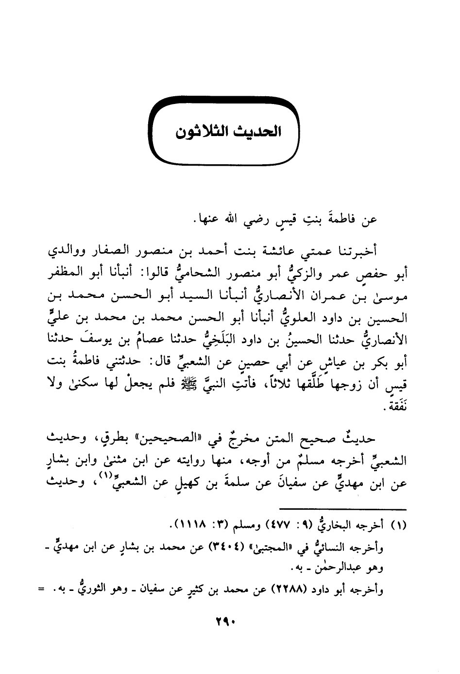 أَخْبَرَتْنَا عَمَّتِي عَائِشَةُ بِنْتُ أَحْمَدَ بْنِ مَنْصُورٍ الصَّفَّارُ، وَوَالِدِي أَبُو حَفْصٍ عُمَرُ، وَالزَّكِيُّ أَبُو مَنْصُورٍ الشَّحَامِيُّ، قَالُوا: أَنْبَأَنَا أَبُو الْمُظَفَّرِ مُوسَى بْنُ عِمْرَانَ الْأَنْصَارِيُّ، أَنْبَأَنَا السَّيِّدُ أَبُو الْحَسَنِ مُحَمَّدُ بْنُ الْحُسَيْنِ بْنِ دَاوُدَ الْعَلَوِيُّ، أَنْبَأَنَا أَبُو الْحَسَنِ مُحَمَّدُ بْنُ مُحَمَّدِ بْنِ عَلِيٍّ الْأَنْصَارِيُّ، حَدَّثَنَا الْحُسَيْنُ بْنُ دَاوُدَ الْبَلَخِيُّ، حَدَّثَنَا عِصَامُ بْنُ يُوسُفَ، حَدَّثَنَا أَبُو بَكْرِ بْنُ عَيَّاشٍ، عَنْ أَبِي حُصَيْنٍ، عَنِ الشَّعْبِيِّ، قَالَ: حَدَّثَتْنِي فَاطِمَةُ بِنْتُ قَيُسْ، «أَنَّ زَوْجَهَا طَلَّقَهَا ثَلَاثًا، فَأَتَتِ النَّبِيَّ صَلَّى اللَّهُ عَلَيْهِ وَسَلَّمَ، فَلَمْ يَجْعَلْ لَهَا سُكْنًى وَلَا نَفَقَةً» ، حَدِيثٌ صَحِيحُ الْمَتْنِ مُخْرَجٌ فِي الصَّحِيحَيْنِ بِطُرُقٍ، وَحَدِيثُ الشَّعْبِيِّ أَخْرَجَهُ مُسْلِمٌ مِنْ أَوْجُهٍ، مِنْهَا رِوَايَتُهُ عَنِ ابْنِ مُثَنَّى، وَابْنِ بَشَّارٍ، عَنِ ابْنِ مَهْدِيٍّ، عَنْ سُفْيَانَ، عَنْ سَلَمَةَ بْنِ كُهَيْلٍ، عَنِ الشَّعْبِيِّ، وَحَدِيثُ