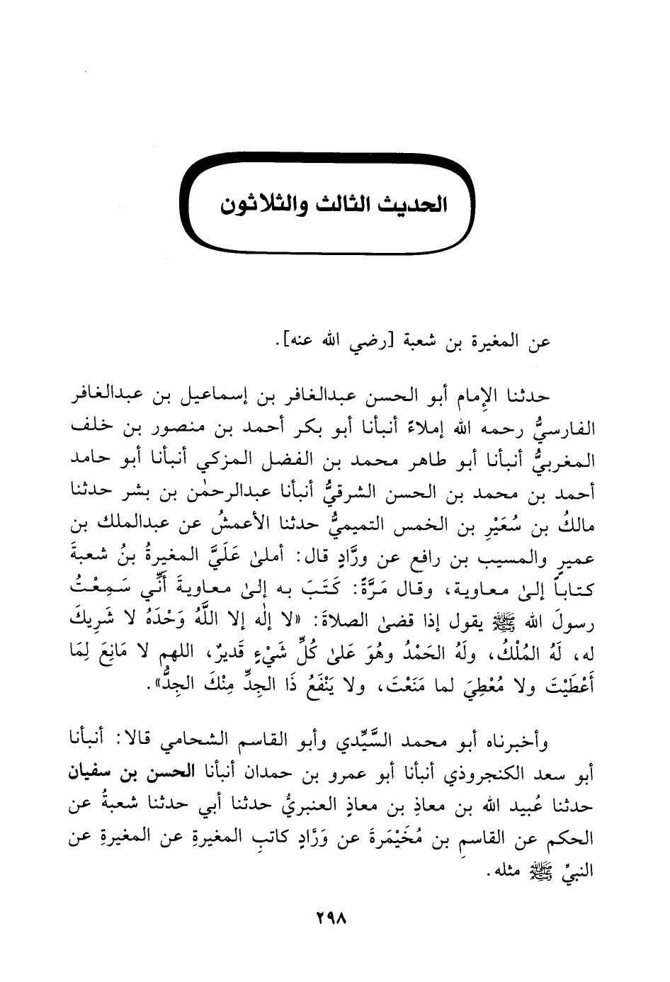 حَدَّثَنَا الْإِمَامُ أَبُو الْحَسَنِ عَبْدُ الْغَافِرِ بْنُ إِسْمَاعِيلَ بْنِ عَبْدِ الْغَافِرِ الْفَارِسِيُّ، رَحِمَهُ اللَّهُ، إِمْلَاءً، أَنْبَأَنَا أَبُو بَكْرٍ أَحْمَدُ بْنُ مَنْصُورِ بْنِ خَلَفٍ الْمَغْرِبِيُّ، أَنْبَأَنَا أَبُو طَاهِرٍ مُحَمَّدُ بْنُ الْفَضْلِ الْمُزَكِّي، أَنْبَأَنَا أَبُو حَامِدٍ أَحْمَدُ بْنُ مُحَمَّدِ بْنِ الْحَسَنِ الشَّرْقِيُّ، أَنْبَأَنَا عَبْدُ الرَّحْمَنِ بْنُ بِشْرٍ، حَدَّثَنَا مَالِكُ بْنُ سُعَيْرِ بْنِ الْخُمْسِ التَّمِيمِيُّ، حَدَّثَنَا الْأَعْمَشُ، عَنْ عَبْدِ الْمَلِكِ بْنِ عُمَيْرٍ، وَالْمُسَيِّبُ بْنُ رَافِعٍ، عَنْ وَرَّادٍ، قَالَ: أَمْلَى عَلَيَّ الْمُغِيرَةُ بْنُ شُعْبَةَ كِتَابًا إِلَى مُعَاوِيَةَ، وَقَالَ مَرَّةً: كَتَبَ بِهِ إِلَى مُعَاوِيَةَ، أَنِّي سَمِعْتُ رَسُولَ اللَّهِ صَلَّى اللَّهُ عَلَيْهِ وَسَلَّمَ يَقُولُ إِذَا قَضَى الصَّلَاةَ: «لَا إِلَهَ إِلَّا اللَّهُ وَحْدَهُ لَا شَرِيكَ لَهُ، لَهُ الْمُلْكُ، وَلَهُ الْحَمْدُ وَهُوَ عَلى كَلِّ شَيْءٍ قَدِيرٌ، اللَّهُمَّ لَا مَانِعَ لِمَا أَعْطَيْتَ وَلَا مُعْطِيَ لِمَا مَنَعْتَ، وَلَا يَنْفَعُ ذَا الْجِدِّ مِنْكَ الْجِدُّ» ، وَأَخْبَرْنَاهُ أَبُو مُحَمَّدٍ السَّيِّدِيُّ، وَأَبُو الْقَاسِمِ الشَّحَامِيُّ، قَالَا: أَنْبَأَنَا أَبُو سَعْدٍ الْكَنْجَرُوذِيُّ، أَنْبَأَنَا أَبُو عَمْرِو بْنِ حِمْدَانَ، أَنْبَأَنَا الْحَسَنُ بْنُ سُفْيَانَ، حَدَّثَنَا عُبَيْدُ اللَّهِ بْنُ مُعَاذِ بْنِ مُعَاذٍ الْعَنْبَرِيُّ، حَدَّثَنَا أَبِي، حَدَّثَنَا شُعْبَةُ، عَنِ الْحَكَمِ، عَنِ الْقَاسِمِ بْنِ مُخَيْمِرَةَ، عَنْ وَرَّادٍ كَاتِبِ الْمُغِيرَةِ، عَنِ الْمُغِيرَةِ، عَنِ النَّبِيِّ صَلَّى اللَّهُ عَلَيْهِ وَسَلَّمَ، مِثْلَهُ.