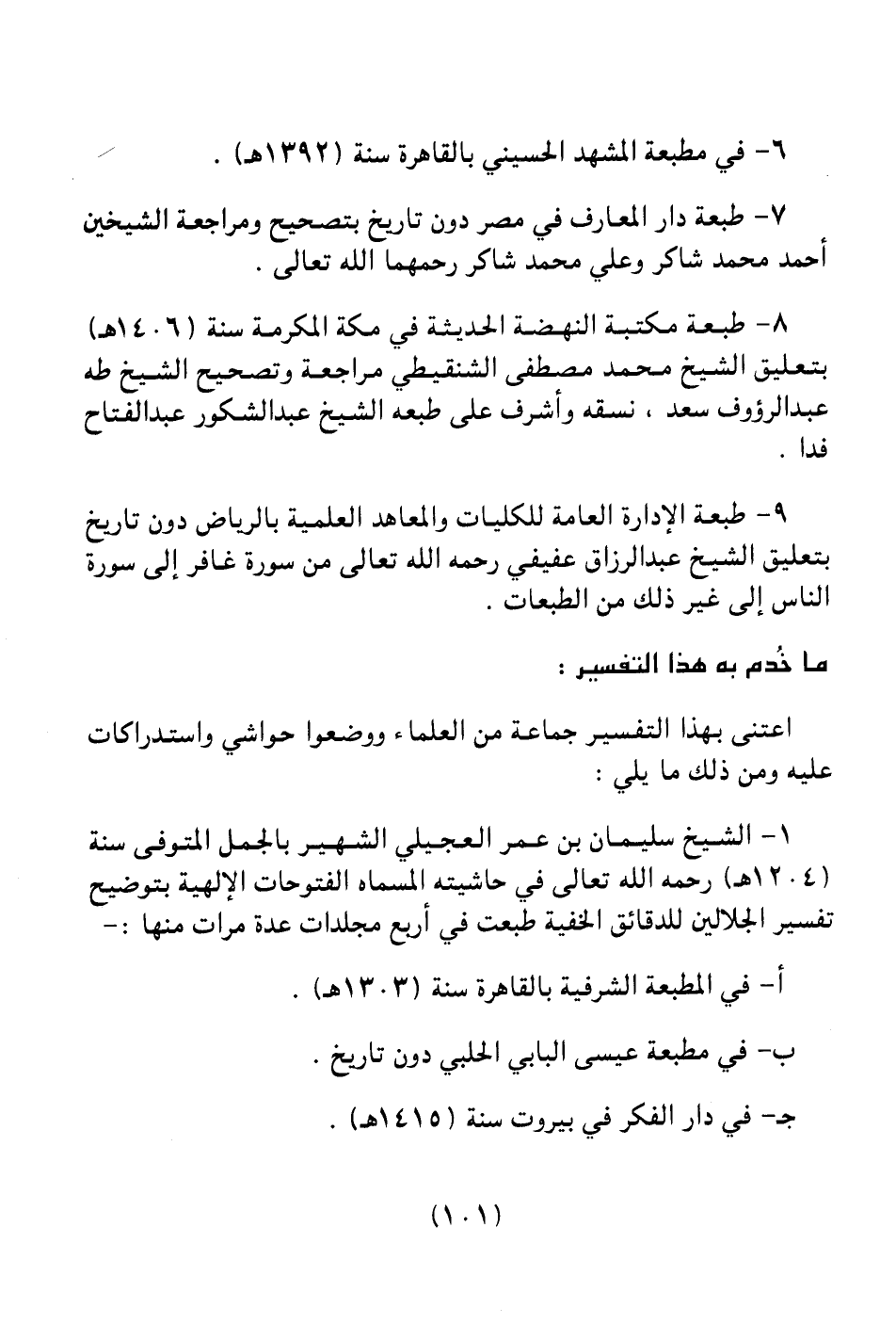 9 ـ طبعة الإدارة العامة للكليات والمعاهد العلمية بالرياض دون تاريخ بتعليق الشيخ عبد الرزاق عفيفي رحمه الله تعالى من سورة غافر إلى سورة الناس إلى غير ذلك من الطبعات.