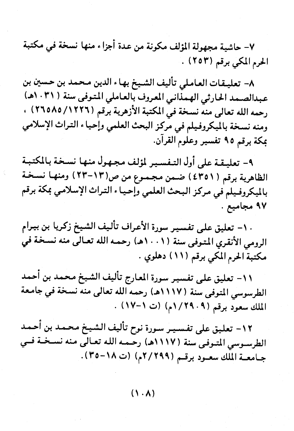 8 ـ تعليقات العاملي تأليف الشيخ بهاء الدين محمد بن حسين بن عبد الصمد الحارثي الهمذاني المعروف بالعاملي المتوفي سنة (1031هـ) رحمه الله تعالى منه نسخة في المكتبة الأزهرية برقم (1226/26585) ، ومنه نسخة بالميكروفيلم في مركز البحث العلمي وإحياء التراث الإسلامي بمكة برقم 95 تفسير وعلوم القرآن.