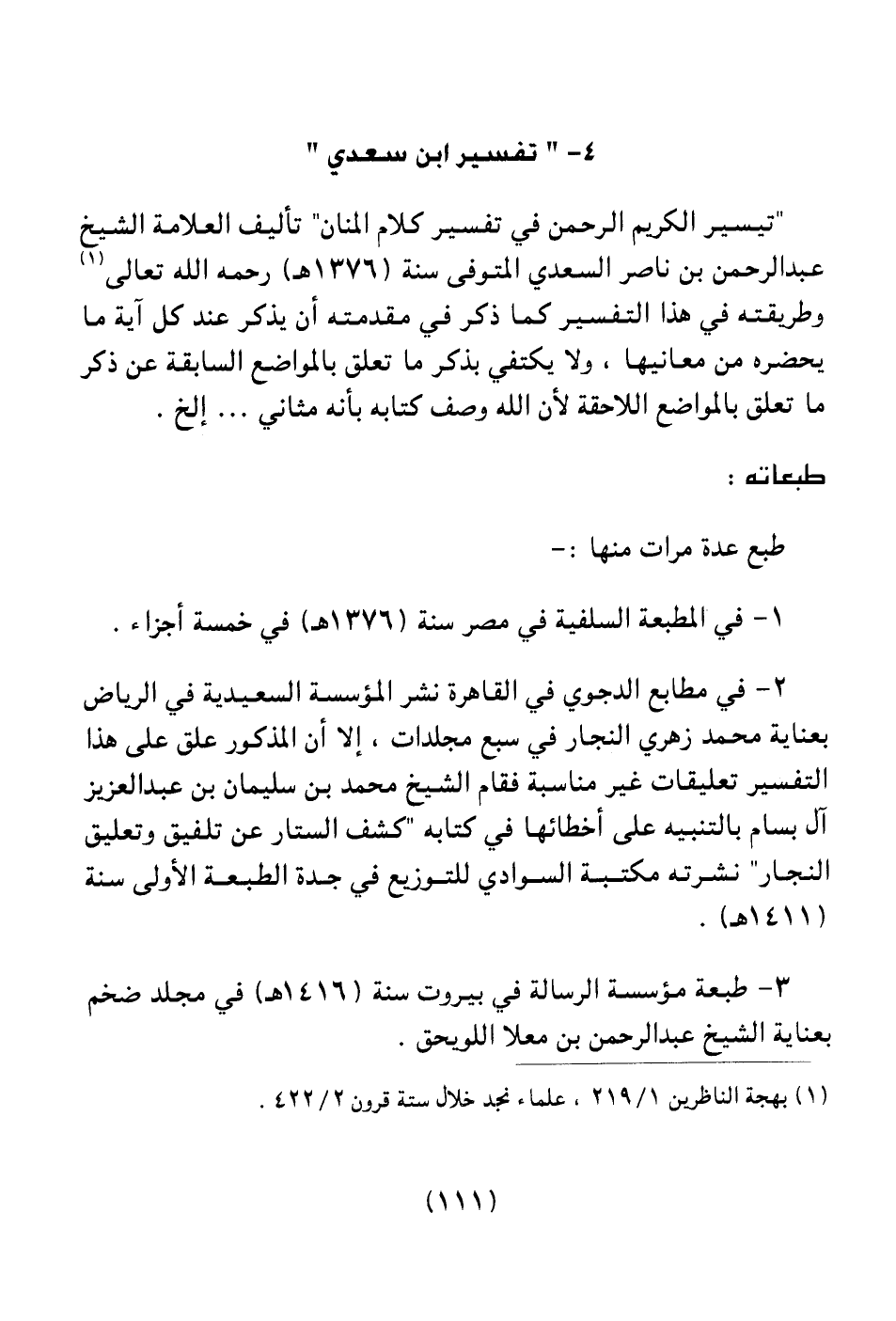 " تيسير الكريم الرحمن في تفسير كلام المنان " تأليف العلامة الشيخ عبد الرحمن بنناصر السعدي المتوفي سنة (1376هـ) رحمه الله تعالى (¬1) وطريقته في هذا التفسير كما ذكر في مقدمته أن يذكر عند كل آية مايحضره من معانيها، ولا يكتفي بذكر ماتعلق بالمواضع السابقة عن ذكر ماتعلق بالمواضع اللاحقة لأن الله وصف كتابه بأنه مثاني ... إلخ.