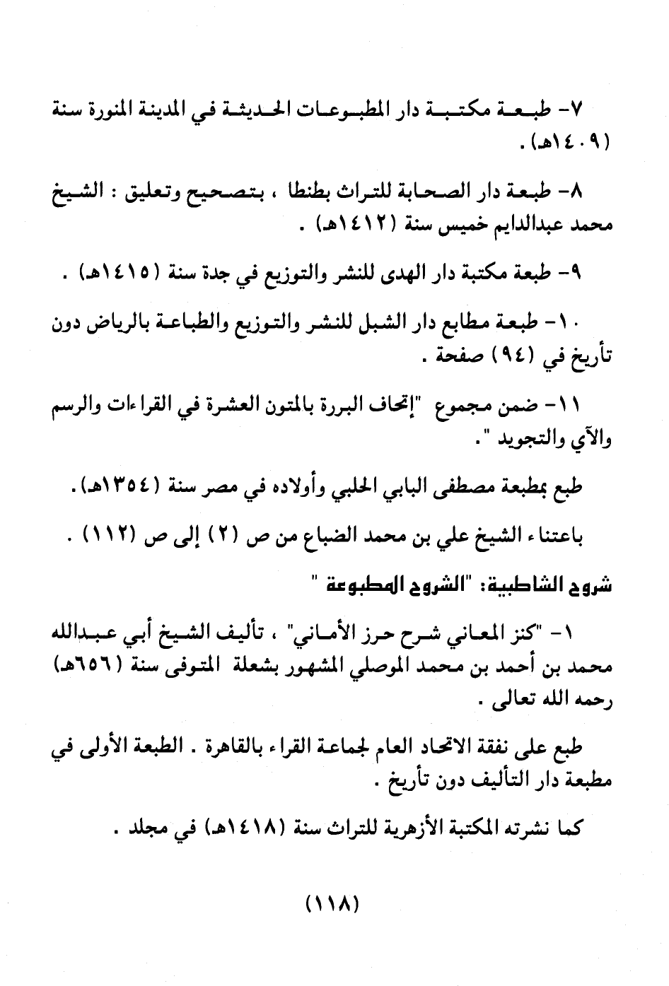 طبع بمطبعة مصطفى البابي الحلبي وأولاده في مصر سنة (1354هـ) . باعتناء الشيخ علي بن محمد الضباع من ص (2) إلى ص (112) .