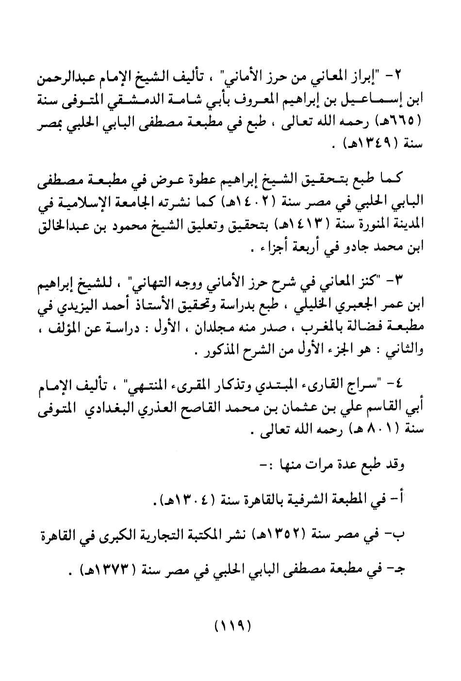 2 ـ " إبراز المعاني من حرز الأماني "، تأليف الشيخ الإمام عبد الرحمن بن إسماعيل بن إبراهيم المعروف بأبي شامة الدمشقي المتوفي سنة (665هـ) رحمه الله تعالى، طبع في مطبعة مصطفى البابي الحلبي سمصر سنة (1349هـ) .