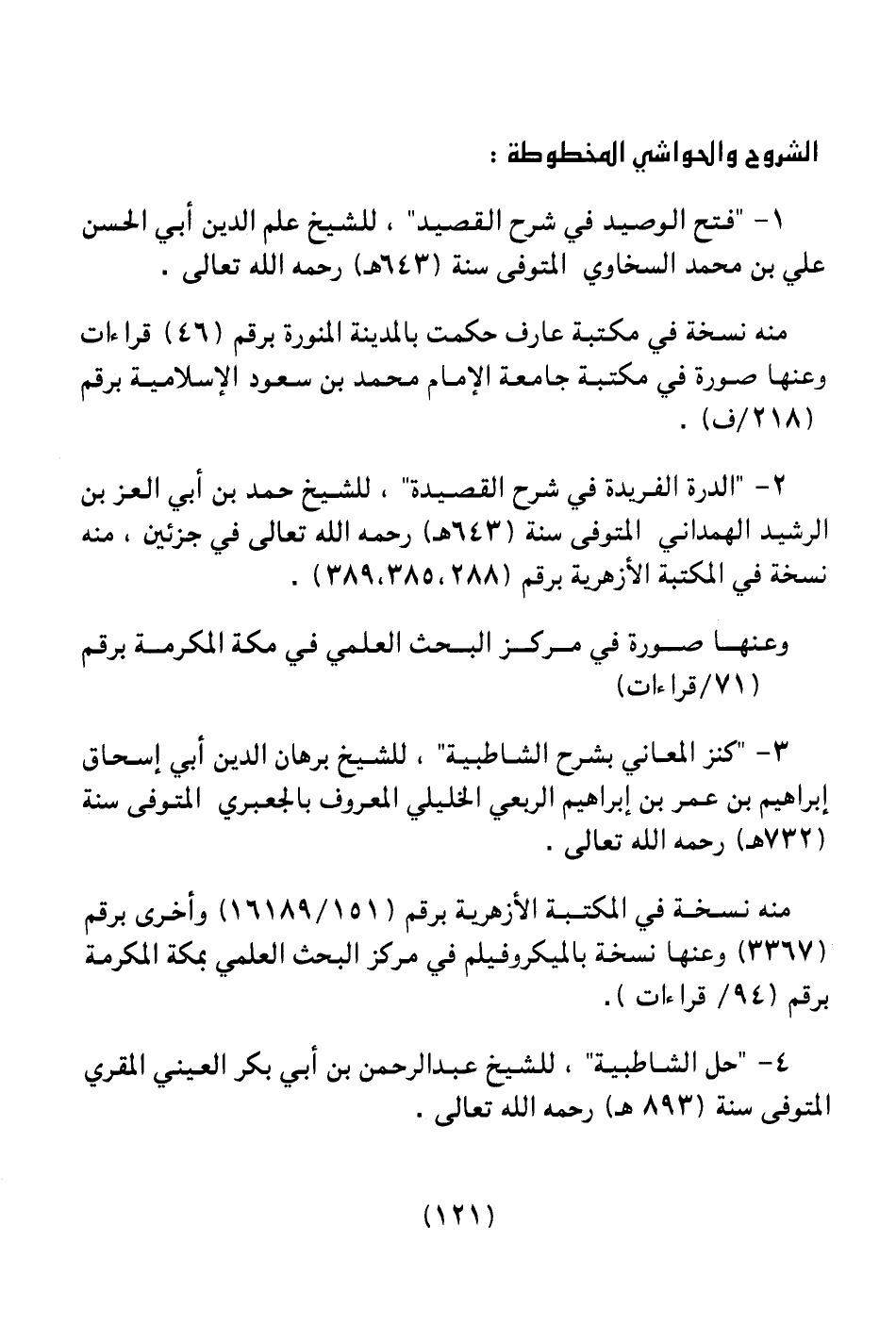 1 ـ " فتح الوصيد في شرح القصيد " للشيخ علم الدين أبي الحسن علي بن محمد السخاوي المتوفي سنة (643هـ) رحمه الله تعالى.