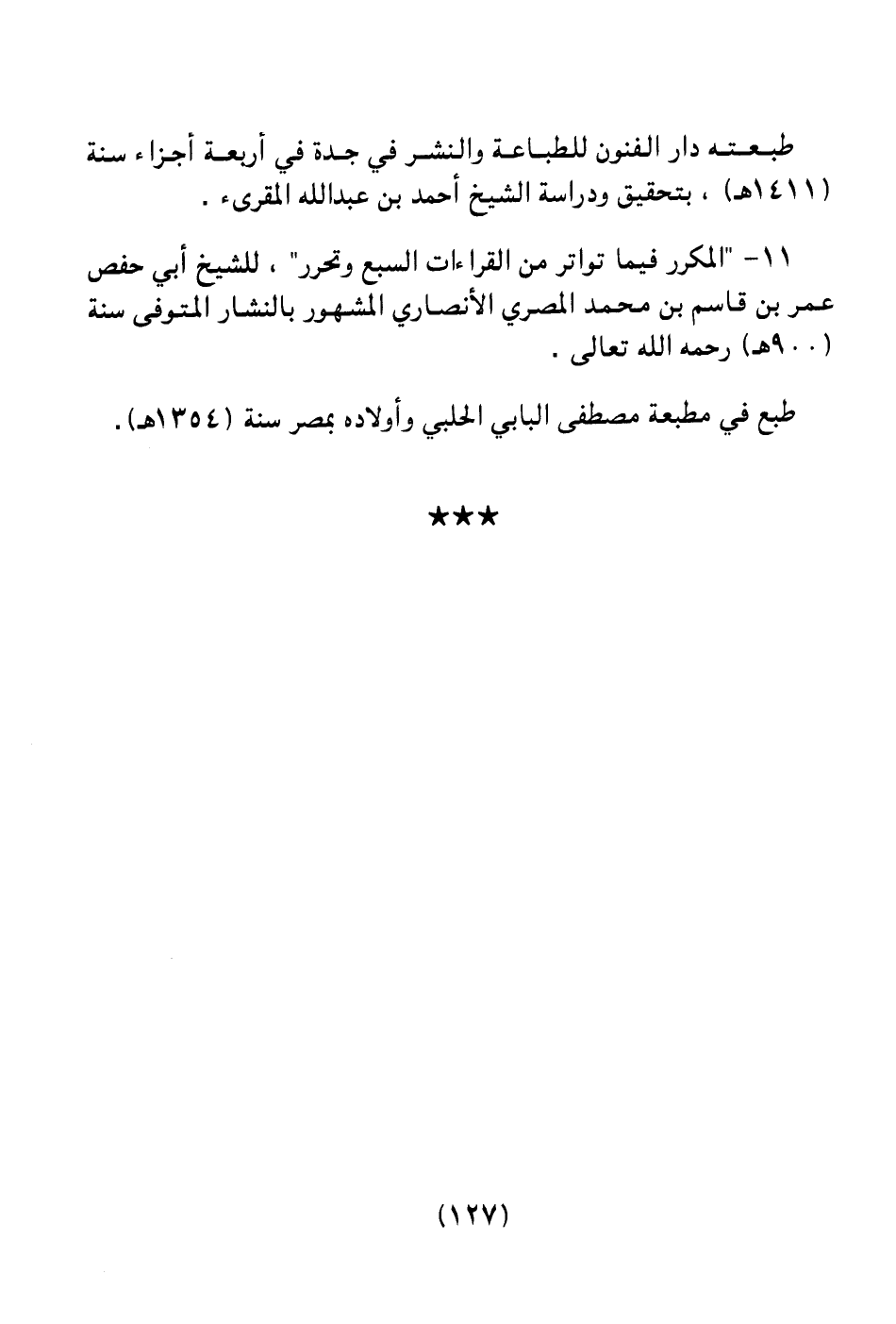 11 ـ " المكرر فيما تواتر من القراءات السبع وتحرير " للشيخ أبي ح فص عمر بن قاسم بن محمد المصري الأنصاري المشهور بالنشار المتوفي سنة (900هـ) رحمه الله تعالى.