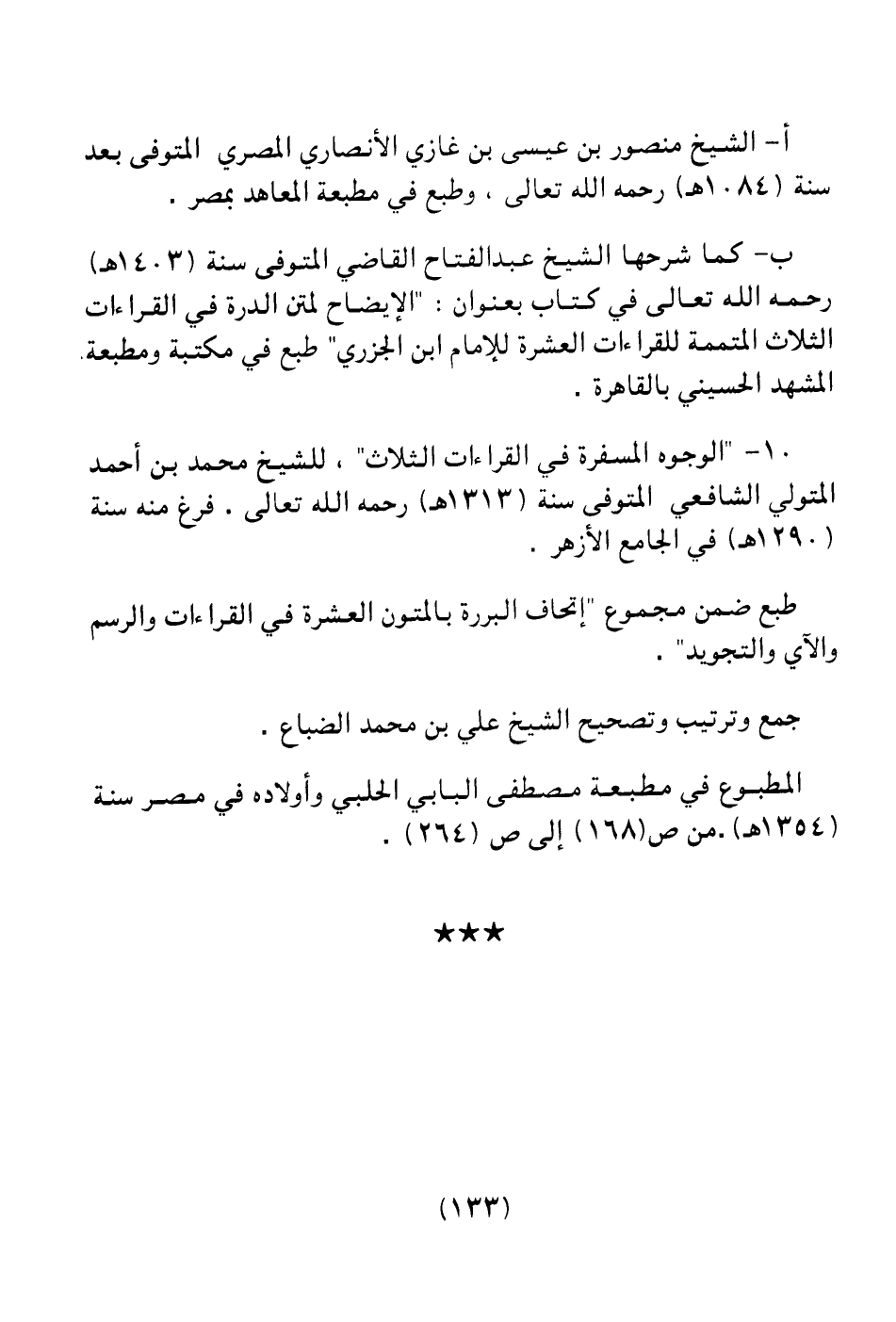 10 ـ " الوجوه المسفرة في القراءات الثلاث " للشيخ محمد بن أحمد المتولي الشافعي المتوفي سنة (1313هـ) رحمه اللهتعالى. فرغ منه سنة (1290هـ) في الجامع الأزهر.
