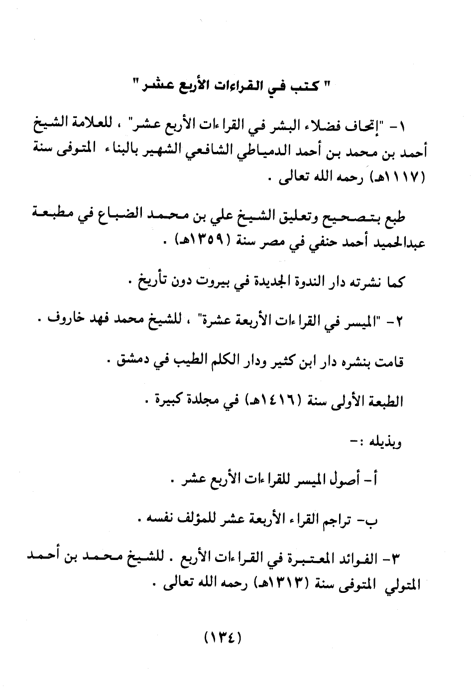 1 ـ " إتحاف فضلاء البشر في القراءات الأربع عشر " للعلامة الشيخ أحمد بن محمد بن أحمد الدمياطي الشافعي الشهير بالبناء المتوفي سنة (1117هـ) رحمه الله تعالى.