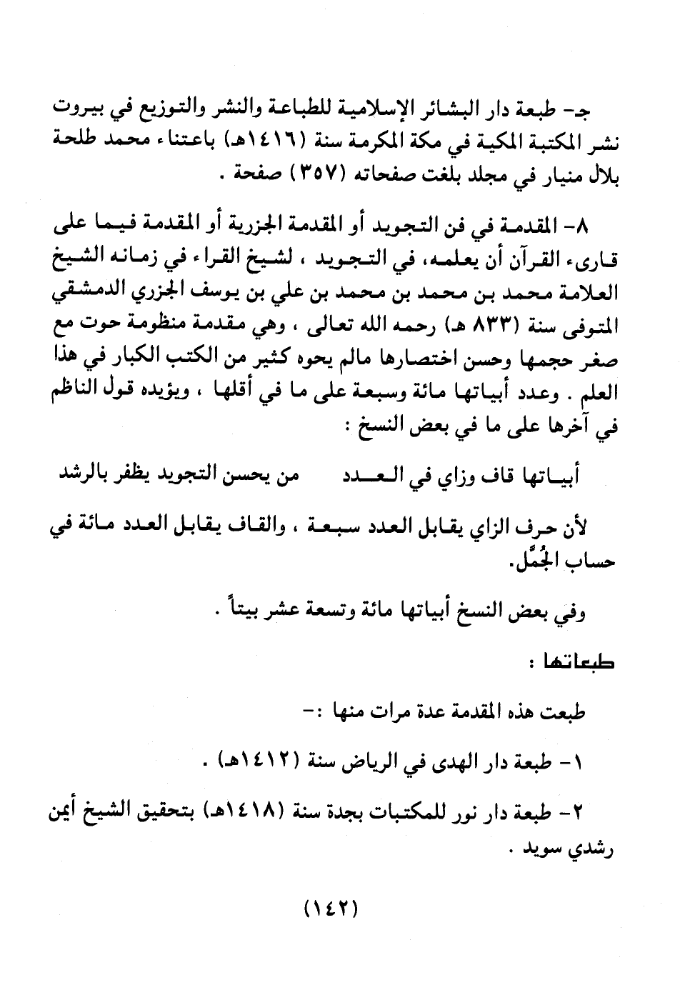 8 ـ المقدمة في فن التجويد أو المقدمة الجزرية أو المقدمة فيما على قارئ القرآن أن يعلمه، في التجويد لشيخ القراء في زمانه الشيخ العلامة محمد بن محمد بن محمد بن علي بن يوسف الجزري الدمشقي المتوفي سنة (833هـ) رحمه الله تعالى، وهي مقدمة منظومة حوت مع صغر حجمها وحسن اختصارها مالم يحوه كثير من الكتب الكبار في هذا العلم. وعدد أبياتها مائة وسبعة على مافي أقلها، ويؤيده قول الناظم في آخرها على مافي بعض النسخ.