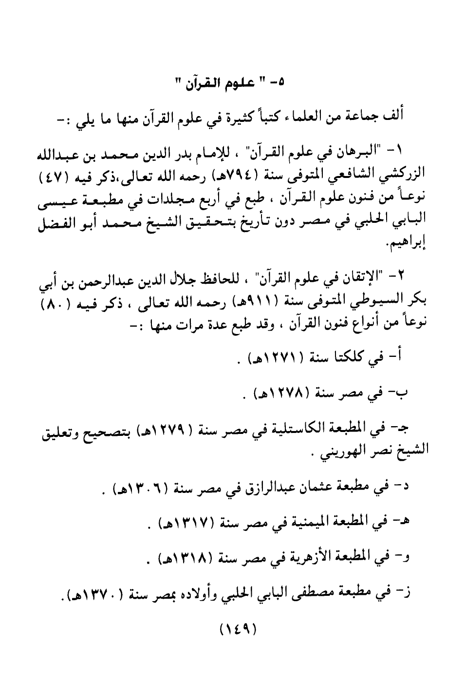 1 ـ " البرهان في علوم القرآن " للإمام بدر الدين محمد بن عبد الله الزركشي الشافعي المتوفي سنة (764هـ) رحمه الله تعالى ذكر فيه (47) نوعاً من فنون علوم القرآن، طبع في أربع مجلدات في مطبعة عيسى البابي الحلبي في مصر دون تاريخ بتحقيق الشيخ محمد أبو الفضل إبراهيم.