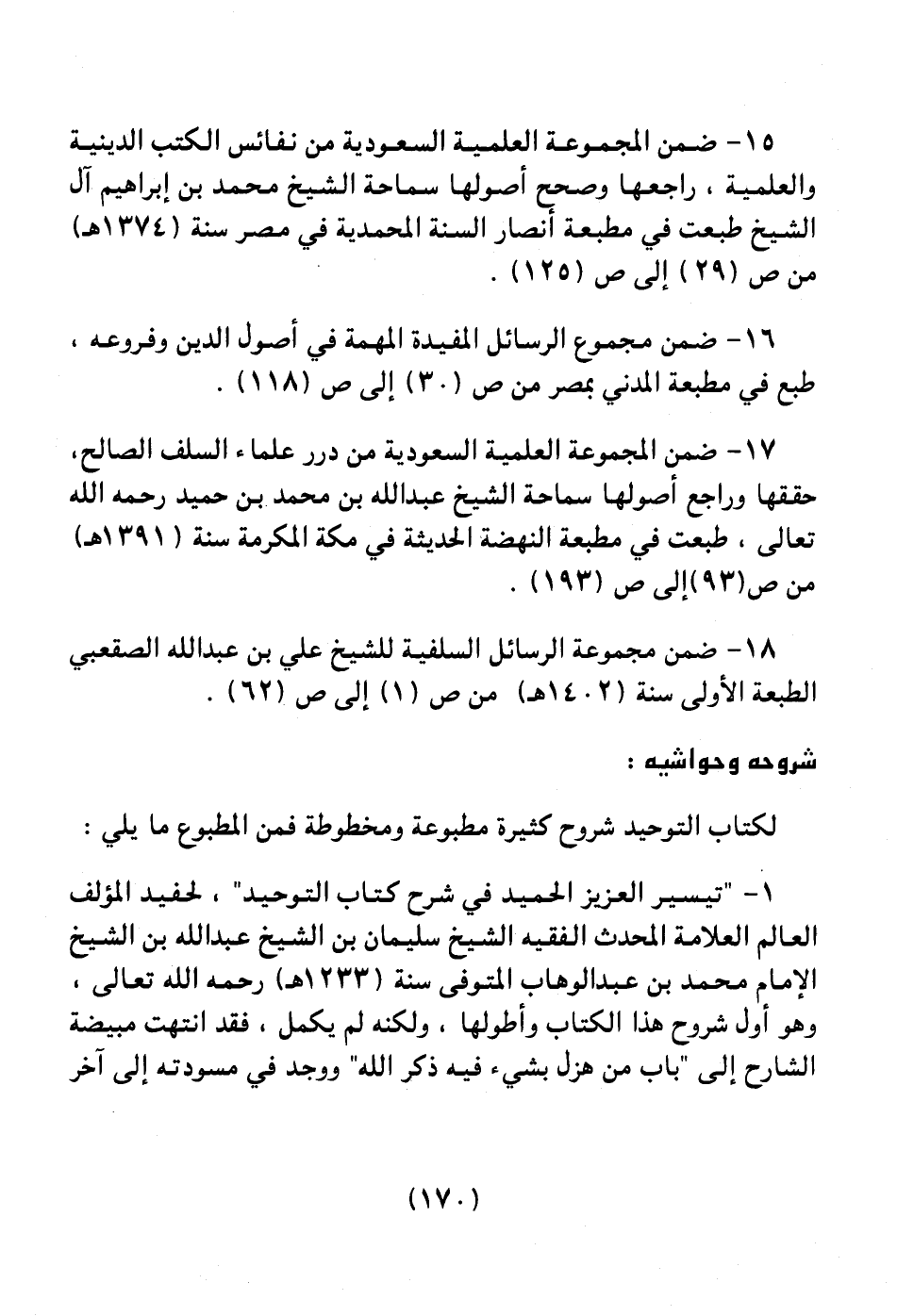 15 ـ ضمن المجموعة العلمية السعودية من نفائس الكتب الدينية والعلمية، راجعها وصحح أصولها سماحة الشيخ محمد بن إبراهيم آل الشيخ طبعت في مطبعة أنصار السنة المحمدية في مصر سنة (1374هـ) من ص (29) إلى ص (125) .
