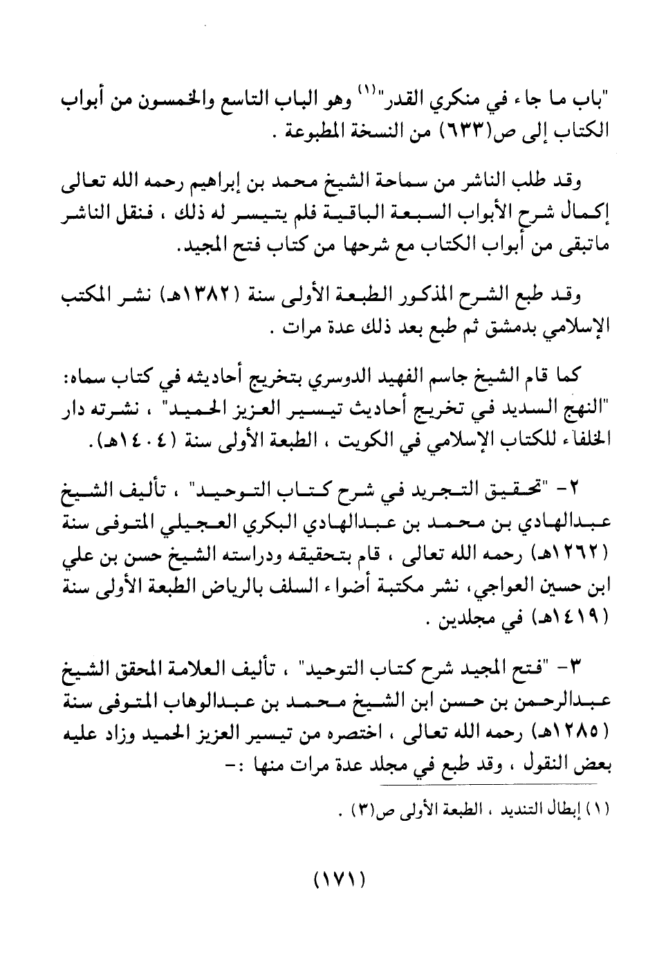 3 ـ " فتح المجيد شرح كتاب التوحيد " تأليف العلامة المحقق الشيخ عبد الرحمن بن حسن ابن الشيخ محمد بن عبد الوهاب المتوفي سنة (1285هـ) رحمه الله تعالى، اختصره من تيسير العزيز الحميد وزاد عليه بعض النقول، وقد طبع في مجلد عدة مرات منها: ـ